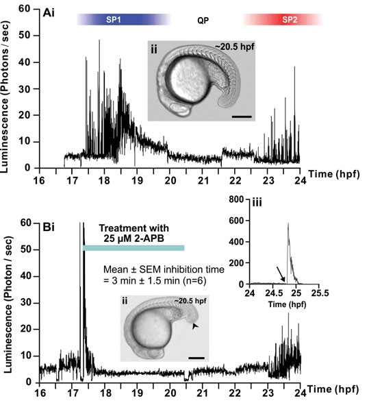 Effect of 2-APB and ryanodine on the trunk Ca2+ signals. Representative temporal profiles of the luminescence generated by α-actin-aeq transgenic embryos that were (Ai) untreated (control; n=9) or treated with (Bi) 25 μM 2-APB (n=6) or (Ci) 50 μM ryanodine (n=7) for 3 hours as soon as the SP1 Ca2+ signals were observed (i.e., at ~17.5 hpf). Data were plotted every 10 s, with each data point representing 10 sec of accumulated luminescence for an imaging field covering the entire embryo (i.e., ~1.24 mm2) from ~16-17 hpf to 24 hpf (i.e., the ~14- to 30-somite stage). Ca2+ signaling period 1 (SP1), Ca2+ signaling quiet period (QP), and Ca2+ signaling period 2 (SP2), observed in the untreated embryo, are shown. (Aii, Bii, Cii) Bright-field images of the (Aii) untreated, (Bii) 2-APBand (Cii) ryanodine-treated embryos at ~20.5 hpf. The arrowheads in (Bii,Cii) indicate the location of the tail-cut procedure, where ~100 μm of the terminal portion of the tail bud was removed. This procedure was performed just prior to incubation with the drugs. Scale bars are 250 μm. (Biii,Ciii) Temporal profiles of the luminescence generated at the end of each imaging experiment when triton X-100 was added (see arrows) to the embryos in order to permeabilize the plasma membrane and thus expose any unspent cytoplasmic aequorin to extracellular Ca2+.