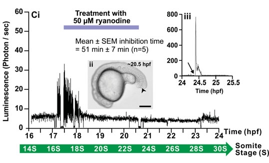 Effect of 2-APB and ryanodine on the trunk Ca2+ signals. Representative temporal profiles of the luminescence generated by ;;alpha;-actin-aeq transgenic embryos that were (Ai) untreated (control; n=9) or treated with (Bi) 25 ;;mu;M 2-APB (n=6) or (Ci) 50 ;;mu;M ryanodine (n=7) for 3 hours as soon as the SP1 Ca2+ signals were observed (i.e., at ~17.5 hpf). Data were plotted every 10 s, with each data point representing 10 sec of accumulated luminescence for an imaging field covering the entire embryo (i.e., ~1.24 mm2) from ~16-17 hpf to 24 hpf (i.e., the ~14- to 30-somite stage). Ca2+ signaling period 1 (SP1), Ca2+ signaling quiet period (QP), and Ca2+ signaling period 2 (SP2), observed in the untreated embryo, are shown. (Aii, Bii, Cii) Bright-field images of the (Aii) untreated, (Bii) 2-APBand (Cii) ryanodine-treated embryos at ~20.5 hpf. The arrowheads in (Bii,Cii) indicate the location of the tail-cut procedure, where ~100 ;;mu;m of the terminal portion of the tail bud was removed. This procedure was performed just prior to incubation with the drugs. Scale bars are 250 ;;mu;m. (Biii,Ciii) Temporal profiles of the luminescence generated at the end of each imaging experiment when triton X-100 was added (see arrows) to the embryos in order to permeabilize the plasma membrane and thus expose any unspent cytoplasmic aequorin to extracellular Ca2+.