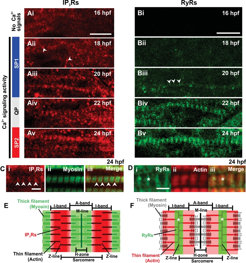 Expression of IP3Rs and RyRs in the trunk musculature. (A,B) Embryos were fixed at the times indicated in the upper right corner of each panel and then the (A) IP3Rs and (B) RyRs were labeled via immunohistochemistry with the anti-Ins3R (Type 1) and 34C antibodies, respectively. Small clusters of IP3Rs at 18 hpf (Aii), and RyRs at 20 hpf (Biii) are indicated with white arrowheads. (C) Dual labeling of (Ci) IP3Rs and (Cii) myosin at 24 hpf. (Ciii) The IP3R and myosin images when merged. Arrowheads indicate the position of the IP3Rs in the z-line SR. (D) Dual labeling of (Di) RyRs and (Dii) actin at 24 hpf. (Diii) The RyR and actin images when merged. Asterisks indicate the position of the RyRs. In (C,D), myosin was labeled via immunohistochemistry with the F59 antibody and actin was labeled with rhodamine phalloidin. (E,F) Schematic representations of a sarcomere to show (E) the pattern IP3R labeling with respect to myosin, and (F) the pattern of RyR labeling with respect to actin. Scale bars are (A,B) 10 μm and (C,D) 3 μm.