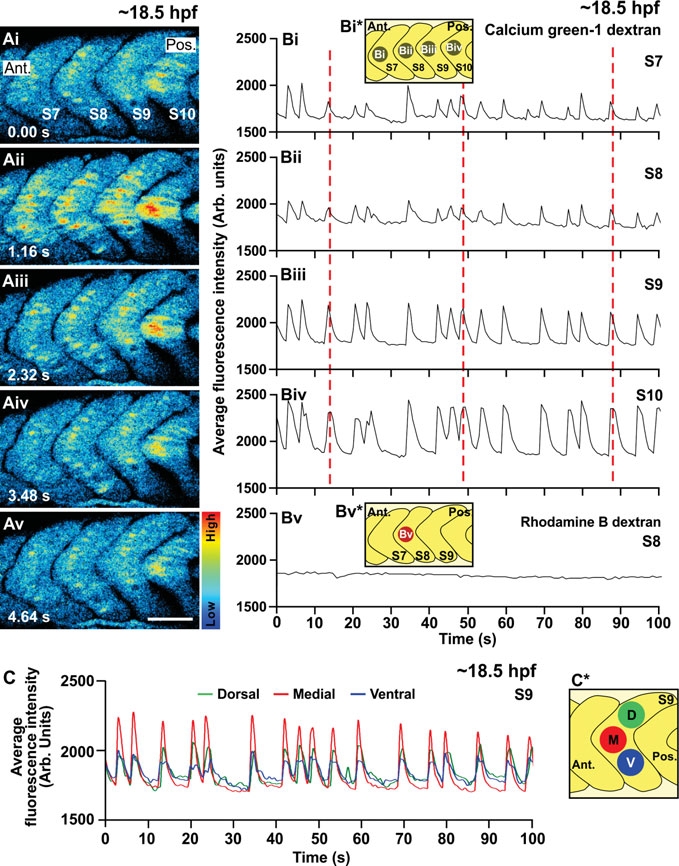 An example of the Ca2+ signals generated in the trunk of a wild-type embryo at ~18.5 hpf as visualized by confocal microscopy using calcium green-1 dextran. (Ai-Av) Representative (n=3) single confocal sections to show the Ca2+ signals generated in somites 7, 8, 9 and 10 at ~18.5 hpf (i.e., the 19-somite stage). The time interval between each image was 1.16 sec. The color scale represents the level of [Ca2+]i, where red indicates a high level and blue indicates a low level. Ant. and Pos. are anterior and posterior, respectively. Scale bar is 50 μm. (Bi- Biv) Temporal profiles of average calcium green-1 dextran fluorescence intensity (in Arb. units) recorded in four ROIs (each covering ~4-5 SMCs, i.e., ~800 μm2) placed in the middle of somites 7, 8, 9 and 10 of this wild-type embryo at ~18.5 hpf (see schematic, panel Bi*). The three red dashed lines help to illustrate the synchronized nature of these signals. (Bv) Temporal profile of average rhodamine B dextran fluorescence intensity (in Arb. units) recorded in an ROI placed in the middle of somite 8 (see schematic, panel Bv*). (C) Temporal profiles of average calcium green-1 dextran fluorescence intensity (in Arb. units) in the dorsal (green), medial (red) and ventral (blue) regions of somite 9, which indicate that the majority of the Ca2+ signals in the dorsal, medial and ventral regions of the somite also occur in synchrony. (C*) Schematic to show the dorsal (D), medial (M) and ventral (V) ROIs.