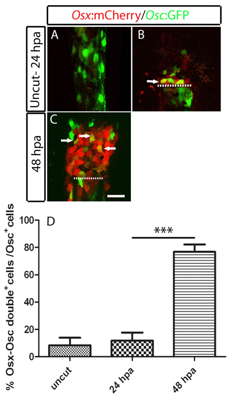 osteocalcin-positive scleroblasts at the blastema start to express de novo osterix, an early marker for skeletal differentiation. (A-C) osterix- and osteocalcin-reporter expression in double Tg(osterix:mCherry; osteocalcin:GFP) fins. (A) Uncut fin. (B) 24 hpa fin. (C) 48 hpa fin. In B and C the arrows indicate cells co expressing osterix and osteocalcin. Each image is a projection of several confocal optical slices. (D) Percentage of double-positive, osterix- and osteocalcin-expressing cells over the total of osteocalcin-expressing cells in the blastema population. There was a significant increase at 48 hpa compared with the uncut and 24 hpa samples (Student′s t-test, P<0.05; n=5 or 6 for each condition). Scale bar: 50 μm. Dashed lines indicate amputation plane.