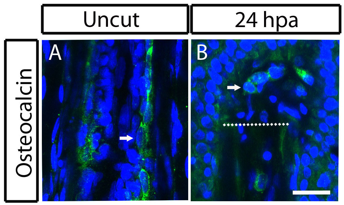 Blastema cells still expresses Osteocalcin 24 hours postamputation of the zebrafish caudal fin. (A,B) Immunohistochemistry for Osteocalcin. (A) Uncut fin. (B) 24 hpa fin. In A, the arrow indicates Osteocalcin-producing bone lining cell. In B, the arrow indicates Osteocalcin-producing cell in the blastema. Scale bar: 50 µm for all panels. Dashed lines indicate amputation plane.
