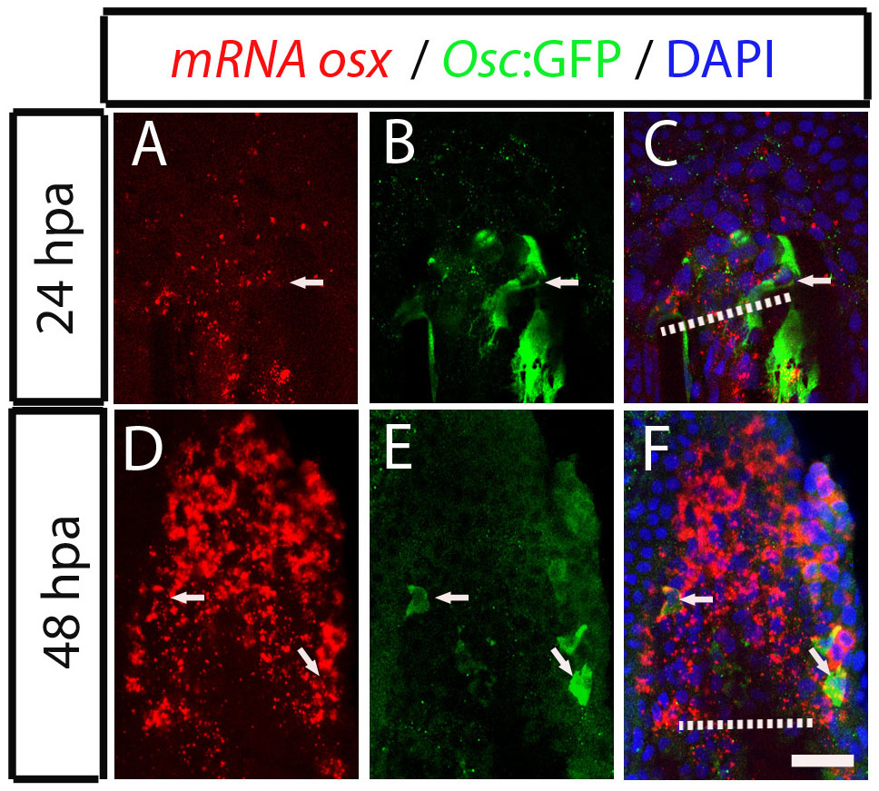 Dedifferentiating osteocalcin-positive scleroblasts at the blastema start to express de novo osterix at 48 hpa. (A-F) Osterix mRNA expression detected by fluorescence in situ hybridization followed by immunohistochemistry against GFP in Tg(osteocalcin:GFP) fins. (A-C) 24 hpa fin. The arrow indicates a osteocalcin-positive cell at the blastema that does not express osterix mRNA, labelled with Fast Red. (D-F) 48 hpa fin. The arrows indicate double positive cells co-expressing osterix mRNA and osteocalcin:GFP. The images are each projections of several confocal optical slices. Scale bar: 50 µm. Dashed lines indicate amputation plane.