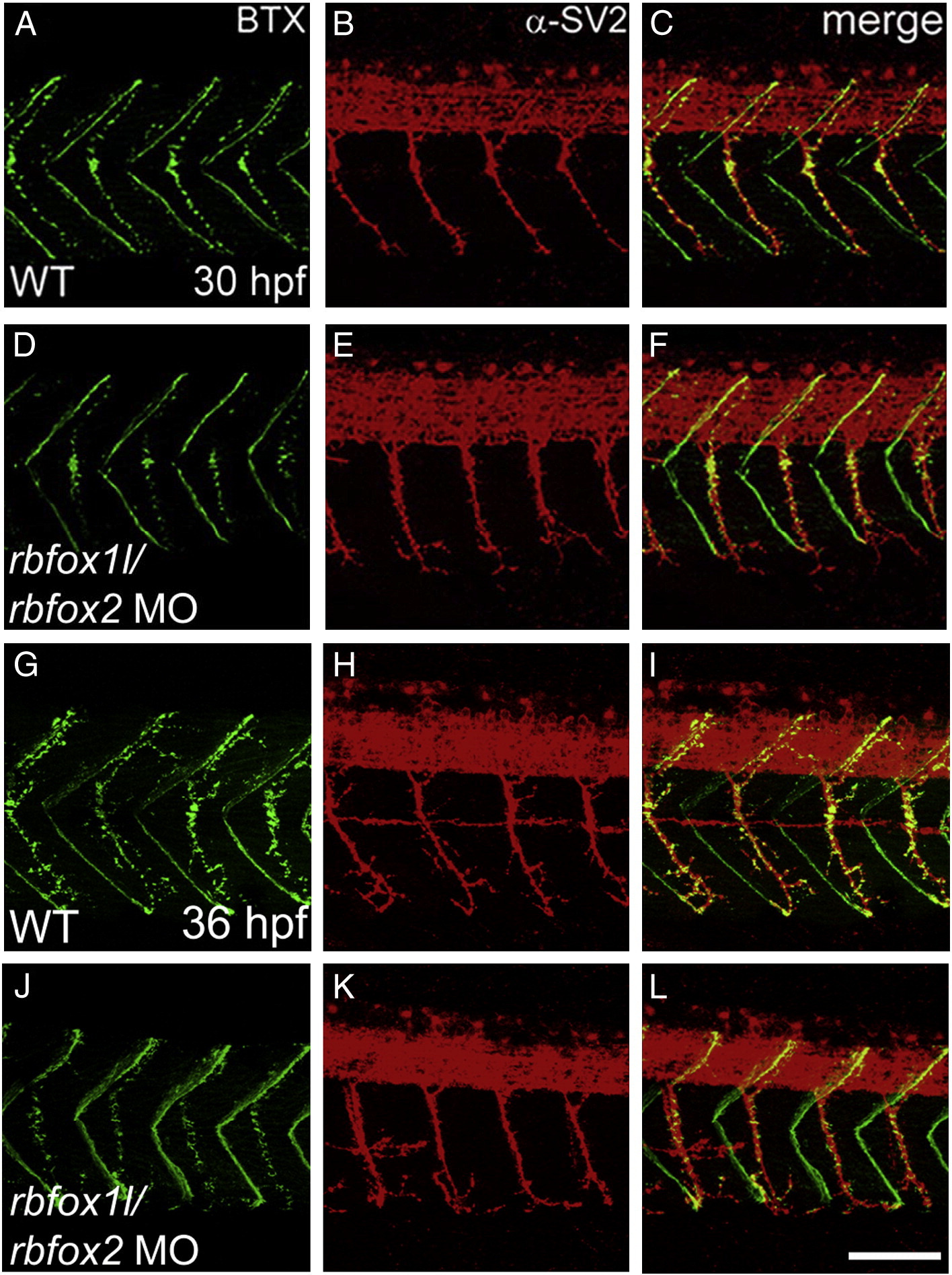 Fig. 7 Rbfox1l/rbfox2 knockdown does not alter neuromuscular junction structure. Pre- and post-synaptic neuromuscular junctions at 30 hpf (A–F) and 36 hpf (G–L), stained with anti-SV2 (red) and alpha-bungarotoxin (BTX, green), respectively, appear structurally normal (lateral view, A–C, G–I vs. D–F, J–L). WT = mock-injected; MO = morpholino. Scale bar = 50 μm.