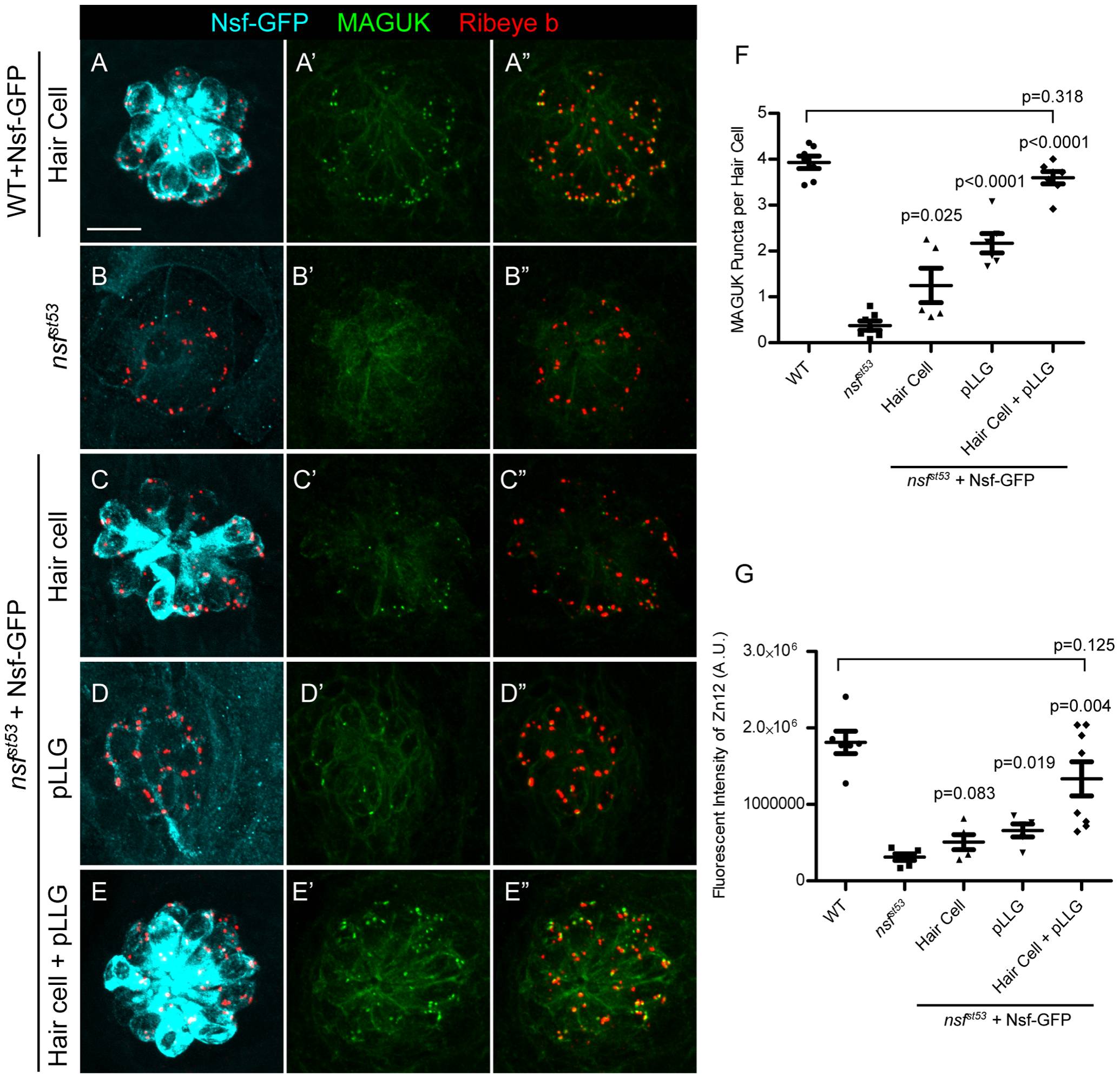 A-E′′, Representative z-projections of a single neuromast from a top-down view (5 dpf). Wild-type (A), nsfst53 mutants (B), and nsfst53 mutants with Nsf-GFP expressed in hair cells (C), pLLG (D), or in both hair cells and pLLG (E) were labeled by antibodies against GFP (pseudo-colored light blue), MAGUK (green), and Ribeye b (red). Scale bar: 10 μm. F, The average number of MAGUK puncta per hair cell in wild-type (3.8 ±0.1, n = 7), nsfst53 mutants (0.4±0.1, n = 7), and nsfst53 mutants with hair-cell Nsf-GFP (1.2±0.4, n = 5), pLLG Nsf-GFP (2.2±0.2, n = 6), or both hair-cells and pLLG Nsf-GFP (3. 6±0.1, n = 7). G, Zebrafish larvae were stained with Zn12 and Ribeye b antibody. The fluorescent intensity (A.U.) of Zn12 was quantified in wild-type (1.813e6±147069, n = 6), nsfst53 mutants (311769±43541, n = 6), and nsfst53 mutants with Nsf-GFP rescued in hair cells (507787±97798, n = 5), pLLG (659674±85851, n = 5), or both hair cells and pLLG (1.335e6±223319, n = 8). The p-values were generated comparing the data from the nsfst53 mutant to each transgenic mutant line.