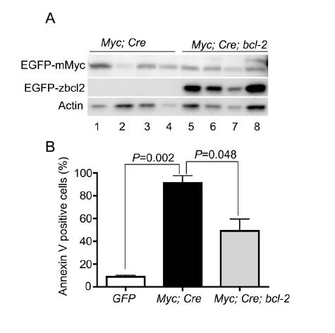 Fig. S1 Similar Myc Levels and bcl-2 Suppression of Myc-induced Apoptosis in Premalignant Thymocytes of Myc;Cre and Myc;Cre;bcl-2 Transgenic Fish. (A) Western blot analyses reveal no significant differences in EGFP-mMyc protein levels in premaligant T-cells of Myc;Cre (n=4) versus Myc;Cre;bcl-2 (n=4) transgenic fish (P=0.67), despite variations of EGFP-mMyc levels among the individual fish and the striking levels of EGFP-zbcl-2 protein. Actin levels serve as a loading control. (B) FACS analysis of Annexin V-positive cells was performed on GFP-expressing control thymocytes of rag2-GFP (GFP) transgenic fish or premaligant thymocytes fromMyc;Cre and Myc;Cre;bcl-2 transgenic fish, respectively. Percentages of AnnexinV-positive cells for GFP vs. Myc;Cre; mean± SD: 8.72 ± 2.72 vs. 91.2 ± 15.77; Myc;Cre vs. Myc;Cre;bcl-2; mean± SD: 91.2 ± 15.77 vs. 49.13 ± 23.27; n=3 fish per group.