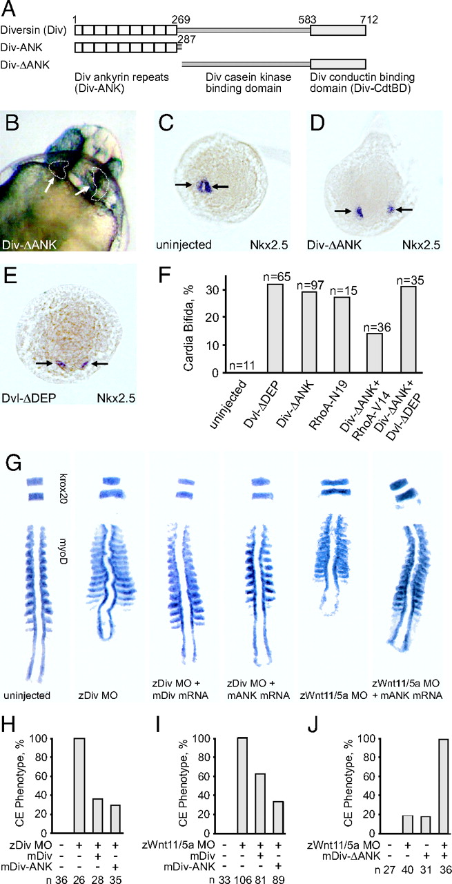 Diversin is essential for heart formation and gastrulation movements in zebrafish embryogenesis. (A) Diversin domain structure and deletion mutants used for mRNA injections. Numbers indicate amino acid positions of mouse Diversin. (B) Zebrafish embryo (at 48 h after fertilization) that was injected with 75 pg of Div-ΔANK mRNA at the one- to two-cell stage shows two separate hearts (marked by arrows and dashed lines). Live beating hearts in this embryo are shown in Movie 1. (C–E) In situ hybridization of Nkx2.5 of zebrafish embryos at 20 h after fertilization indicates single or double heart primordia in the injected embryos (arrows, dorsal view). (C) Heart primordia of uninjected wild-type embryos are paired at the dorsal midline. (D and E) Embryos injected with 75 pg of Div-ΔANK or Dvl- ΔDEP mRNA show two heart primordia located laterally of the dorsal midline. (F) Diversin controls heart formation via the RhoA signaling pathway. Shown is quantification of cardia bifida phenotypes of zebrafish embryos that were injected with the indicated mRNAs. Amounts of injected mRNAs: Div-ΔANK and Dvl-ΔDEP, 75 pg in single injections and 37.5 pg in double injections; RhoA(N19), 30 pg; RhoA(V14), 2 pg. (G) The ankyrin repeat domain of Diversin is crucial for regulation of gastrulation movements in zebrafish embryos. In situ hybridizations of krox20 and myoD of flat-mounted zebrafish embryos are shown (12- to 15-somite stage, dorsal view). One- to two-cell-stage embryos were injected with antisense MO against zebrafish Diversin (Div MO, 1.5 ng) or against zebrafish Wnt11 and Wnt5a (Wnt11/5a MO, 1 + 2 ng), or were coinjected with MO and 50 pg of the indicated mouse Diversin mRNAs. (H and I) Quantification of experiments in G. Embryos were classified as with CE phenotype (not rescued) when anterior/posterior body axis length, shape of the notochord, and compression of somites were similar to MO-injected embryos (in G compare embryos 2 and 5 with embryos 1, 3, 4, and 6). (J) Diversin lacking the ankyrin repeat domain, Diversin-ΔANK, synergistically enhances the induction of CE defects induced by Wnt11 and Wnt5a MO. Zebrafish embryos were injected with Wnt11 and Wnt5a MO (0.5 + 1 ng) or Diversin-ΔANK mRNA (50 pg) or coinjected with both (experiments were quantified as described for G and H). n, number of embryos.