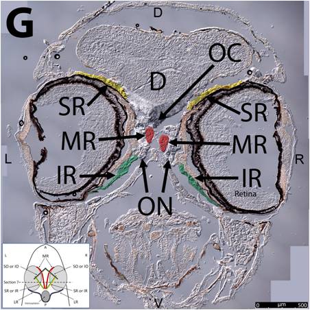 Fig. S19 Key anatomical features within the WT adult zebrafish orbit are highlighted on 12µm thick coronal sections originally imaged using 200X magnification with DIC prisms to show topographical tissue architecture. Sections proceed in the dorsal (S1) to ventral (S12) direction and show all 6 muscles extending from origin to globe insertion. A detailed analysis of the anatomy can be found in the “Results” section of this paper. For easy reference, specific EOMs can be observed on the following figures. Superior oblique (S1–S4). Superior rectus (S1–S10). Inferior Oblique (S3–S12). Inferior rectus (S7–S12). Medial rectus (S5–S10). Lateral rectus (S7–S11). Anterior (A), posterior (P), left (L), and right (R) directions are noted on each frame and a schematic illustrating the specific plane of section is located in the lower left corner.
