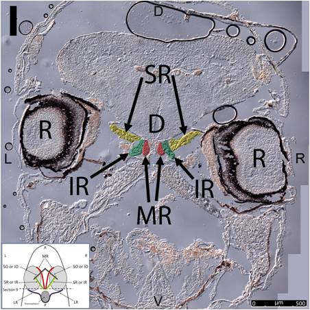 Fig. S21 Key anatomical features within the WT adult zebrafish orbit are highlighted on 12µm thick coronal sections originally imaged using 200X magnification with DIC prisms to show topographical tissue architecture. Sections proceed in the dorsal (S1) to ventral (S12) direction and show all 6 muscles extending from origin to globe insertion. A detailed analysis of the anatomy can be found in the “Results” section of this paper. For easy reference, specific EOMs can be observed on the following figures. Superior oblique (S1–S4). Superior rectus (S1–S10). Inferior Oblique (S3–S12). Inferior rectus (S7–S12). Medial rectus (S5–S10). Lateral rectus (S7–S11). Anterior (A), posterior (P), left (L), and right (R) directions are noted on each frame and a schematic illustrating the specific plane of section is located in the lower left corner.