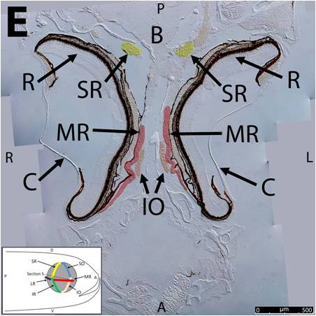 Fig. S5 Key anatomical features within the WT adult zebrafish orbit are highlighted on 12µm thick coronal sections originally imaged using 200X magnification with DIC prisms to show topographical tissue architecture. Sections proceed in the dorsal (S1) to ventral (S12) direction and show all 6 muscles extending from origin to globe insertion. A detailed analysis of the anatomy can be found in the “Results” section of this paper. For easy reference, specific EOMs can be observed on the following figures. Superior oblique (S1–S4). Superior rectus (S1–S10). Inferior Oblique (S3–S12). Inferior rectus (S7–S12). Medial rectus (S5–S10). Lateral rectus (S7–S11). Anterior (A), posterior (P), left (L), and right (R) directions are noted on each frame and a schematic illustrating the specific plane of section is located in the lower left corner.