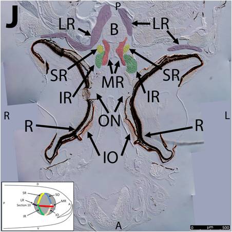 Fig. S10 Key anatomical features within the WT adult zebrafish orbit are highlighted on 12µm thick coronal sections originally imaged using 200X magnification with DIC prisms to show topographical tissue architecture. Sections proceed in the dorsal (S1) to ventral (S12) direction and show all 6 muscles extending from origin to globe insertion. A detailed analysis of the anatomy can be found in the “Results” section of this paper. For easy reference, specific EOMs can be observed on the following figures. Superior oblique (S1–S4). Superior rectus (S1–S10). Inferior Oblique (S3–S12). Inferior rectus (S7–S12). Medial rectus (S5–S10). Lateral rectus (S7–S11). Anterior (A), posterior (P), left (L), and right (R) directions are noted on each frame and a schematic illustrating the specific plane of section is located in the lower left corner.