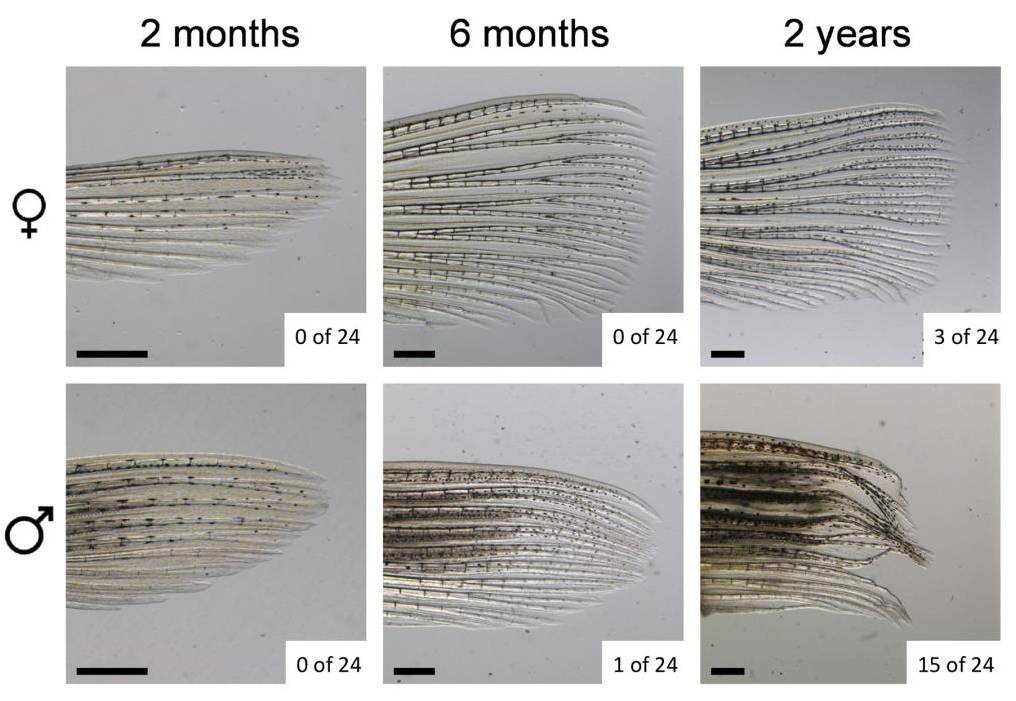 Fig. S4 Aging Male Zebrafish Display Atrophied Pectoral Fins A high proportion of males display bilateral pectoral fin defects at 2 years, including atrophy, ray folding, and ray fusion, while these conditions are rare in females. n = 24, Fisher-Irwin exact test, *p < 0.05.