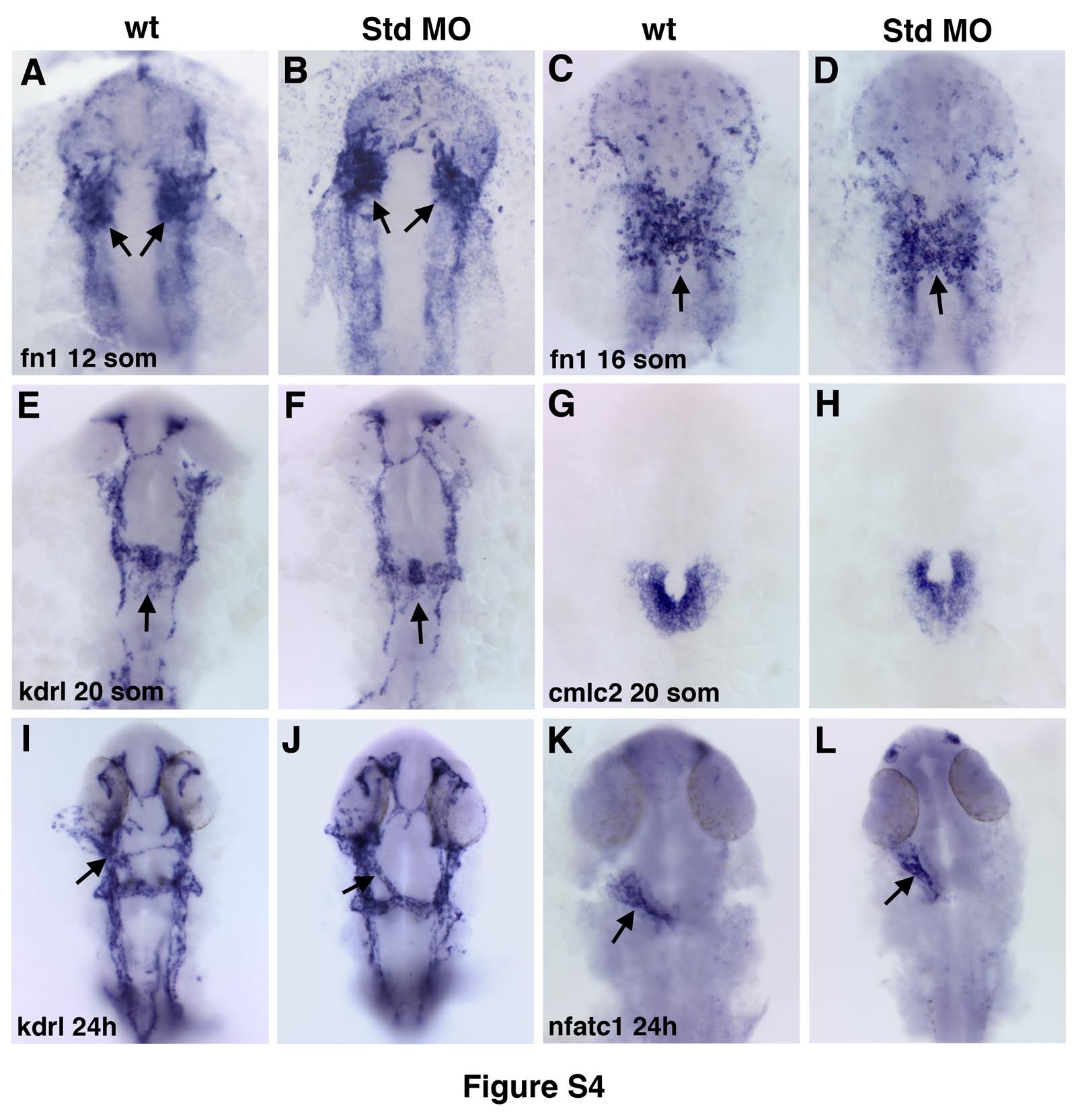 Endocardial (arrows) fn1 (A-D), kdrl (E,F,I,J), nfatc1 (K,L) and myocardial cmlc2 (G,H) expression is not significantly affected in standard MO-injected embryos compared to uninjected controls.