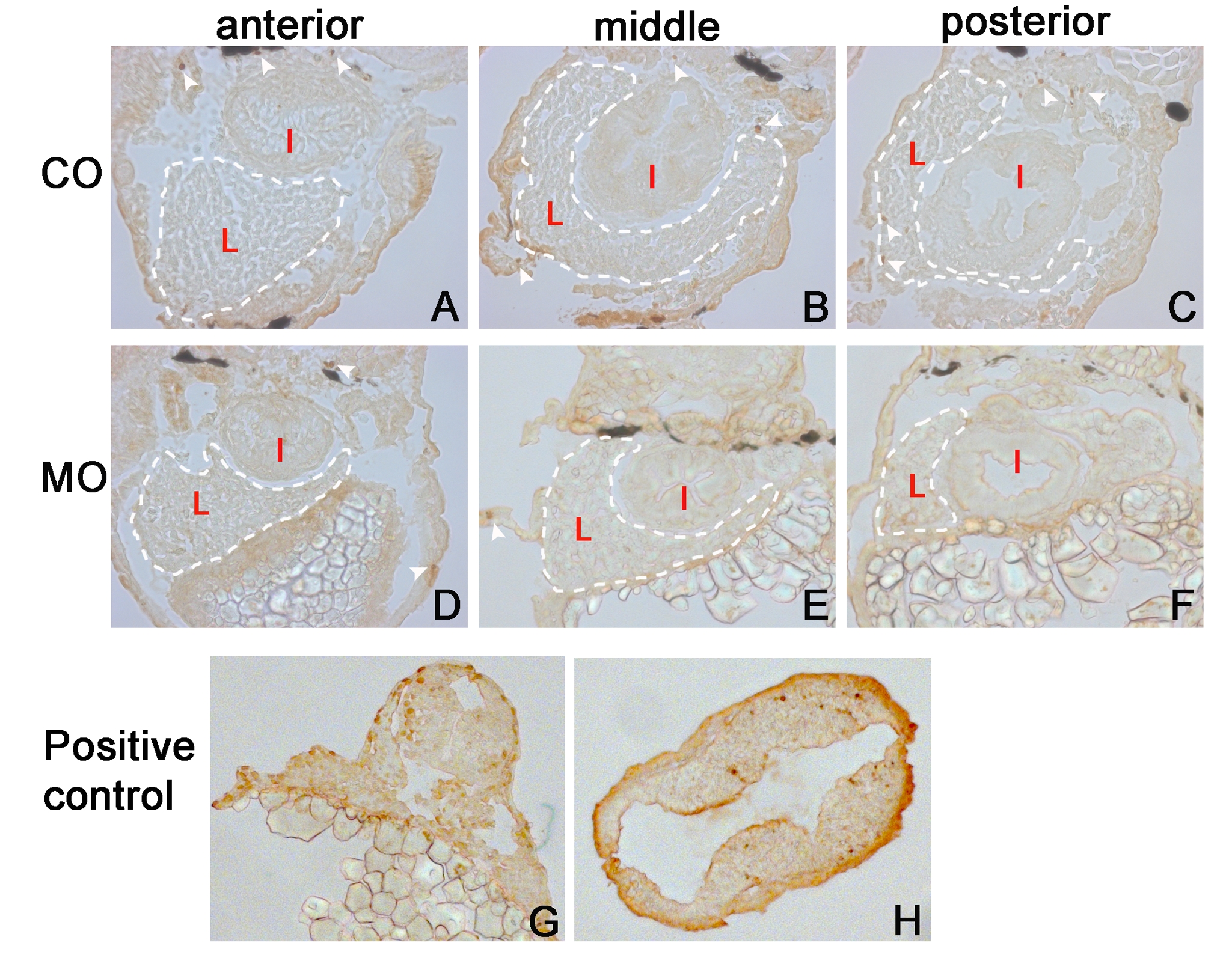 Hepatocyte apoptosis is not elevated in alr morphants. A–F, TUNEL assay performed on 4 dpf embryo liver sections. White dashed lines outline the liver. White arrowheads indicate some of the positively stained cells, which are undergoing apoptosis. Very low levels of apoptosis are found in the developing livers of wild type embryos and alr morphants. G, DNase treated sample from 30 hpf embryos, as a positive control. H, brain section from 30 hpf embryos, treated by heat shock (39 degree, 1 hour) to induce apoptosis, as a positive control. L: liver; I: intestine. (Yabu et al., 2001) Yabu, T., Todoriki, S., Yamashita, M., 2001. Stress-induced apoptosis by heat shock, UV and γ-ray irradiation in zebrafish embryos detected by increased caspase activity and whole-mount TUNEL staining. Fisheries Science 67, 333–340.