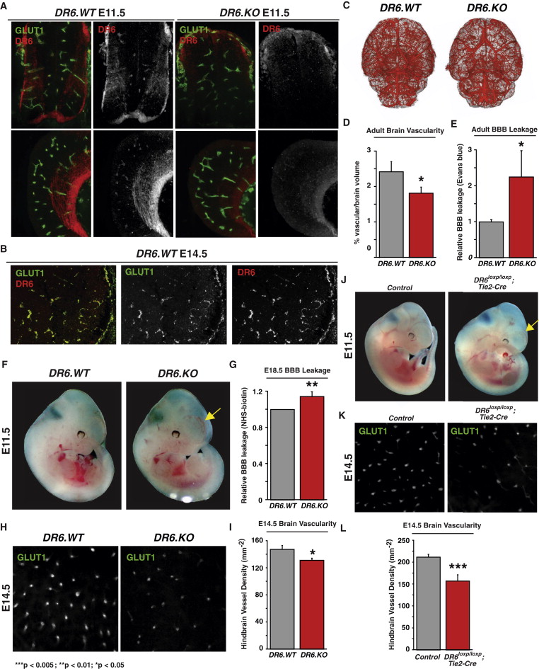 DR6 Is Required for Proper CNS Vascular Density and Barrier Function in Mice in a Cell-Autonomous Fashion (A) DR6 protein expression in CNS commissural axons and GLUT1-positive vasculature. Immunohistochemical staining for DR6 protein exhibited both neuronal and vascular signal in spinal cord (top panels) and forebrain (bottom panels) tissue from E11.5 embryos. This signal is specific to DR6 protein, as no antibody staining was apparent in DR6.KO embryos (right panels). Results representative of at least three independent experiments are shown. WT, wild-type; KO, knockout. (B) DR6 mRNA expression in Glut1-positive vasculature. Dual-target two-color fluorescent in situ hybridization was used to detect DR6 (red) and Glut1 (green) transcripts in mouse E14.5 brains. Results representative of at least three independent experiments are shown. (C) MicroCT angiographic surface renderings of adult mouse brain vasculature. 2D projections of DR6.WT and DR6.KO brains are shown. Results representative of six independent experiments are shown. (D) Quantification of microCT CNS vascular network. Vascular density was calculated as a function of vascular volume normalized by brain volume. n = 6 (DR6.WT), n = 6 (DR6.KO). (E) Evans blue leakage assay detects barrier defects in adult mice. n = 7 (DR6.WT), n = 8 (DR6.KO). (F) E11.5 DR6.KO embryos exhibit forebrain-specific hemorrhaging (observed in 60% embryos tested; arrow). Results representative of at least three independent experiments are shown. (G) Fixable biotin transcardiac perfusion assay detects barrier defects in E18.5 mouse embryos. n = 12 (DR6.WT), n = 12 (DR6.KO). (H) DR6.KO embryos exhibit reduced hindbrain vascular density at E14.5. Confocal images of flat-mounted hindbrains representative of at least nine independent experiments are shown. (I) Quantification of E14.5 mouse hindbrain vascular density. Vascular density was calculated as a function of number of GLUT1-positive hindbrain radial vessels normalized by field area. n = 12 (DR6.WT), n = 11 (DR6.KO). (J) E11.5 DR6flox/flox;Tie2-Cre embryos exhibit forebrain-specific hemorrhaging (observed in 80% embryos tested; arrow). Results representative of at least three independent experiments are shown. (K) E11.5 DR6flox/flox;Tie2-Cre embryos exhibit reduced hindbrain vascular density at E14.5. Confocal images of flat-mounted hindbrains representative of at least nine independent experiments are shown. (L) Quantification of E14.5 mouse hindbrain vascular density. Vascular density was calculated as described above. n = 15 (control), n = 11 (DR6flox/flox;Tie2-Cre). Data are presented as the mean ± SEM (***p < 0.005; **p < 0.01; *p < 0.05). See also Figure S4.