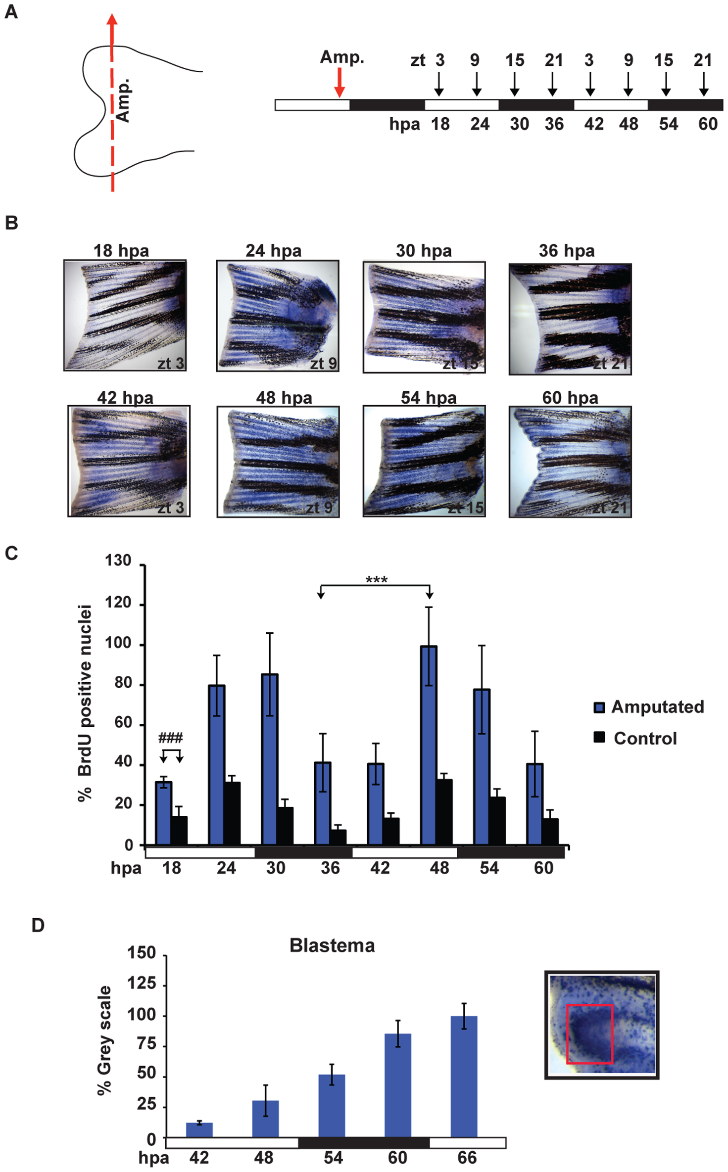 (A) Schematic representation of the experimental plan showing the amputation site (left panel), the times of sampling (ZT, right panel,,above) and the corresponding hours post amputation (hpa, right panel, below). Amputation was performed before the light-dark transition (ZT 9, red arrow) and fins were subsequently harvested every 6 hours (starting from 18 hpa). Each time point was collected following a 15 minutes incubation with BrdU. (B) Representative fins stained for BrdU incorporation at the time points indicated in panel A. (C) Quantification of the number of S-phase nuclei in amputated fins (blue bars) and non-amputated controls (black bars). On the Y-axis is plotted the % of BrdU positive nuclei with respect to the sample with the largest value (amputated, 48 hpa). The result of statistical analysis of the peak and trough values for the amputated fins is indicated by asterisks (Bonferroni′s post hoc test p<0.0001) and horizontal “brackets” above the graph. Furthermore, statistically significant differences observed at each time point between the amputated and control non-amputated fins are indicated for simplicity, by the symbol “#” and a bracket above only the first time point (18 hpa) (Bonferroni′s post hoc test p<0.0001, ###). (D) Quantification of the level of BrdU staining at the ray tips in the blastema region using Scion Image software. Inset panel (D): magnified view of the fin ray tips region stained for BrdU incorporation. A red square delimits the area that has been quantified. White and black bars below each panel indicate the light and dark periods. All the quantitative data were subjected to Cosinor analysis to test for the presence or absence of 24-h rhythmicity (see Table S1, Figure S2). Each time point represents the mean values calculated for each fin ray in a total of n = 4 to 6 fins and expressed as % of the grey scale value.