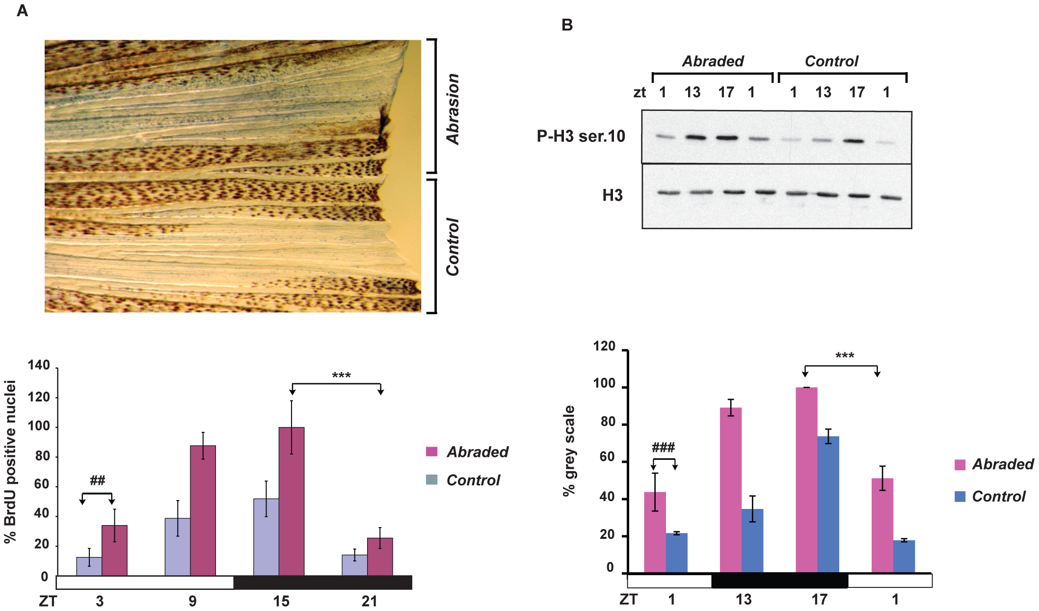 (A), Upper section: Representative image of BrdU-stained caudal fin 48 hours after half of its surface was abraded. The remaining, non-treated half of the fin served as an internal control. Lower section: The results of quantification of the number of BrdU positive nuclei measured each 6 hours during one 24 hours period between 24 and 48 hours following abrasion performed at ZT3. On the Y-axis is plotted the % of BrdU positive nuclei with respect to the largest value (ZT15, abraded). (B) Western blot analysis using P-H3 Ser 10 and H3 antibodies and its quantification (below) of whole protein extracts prepared from the abraded and non-abraded (control) sections of fins. On the Y-axis is plotted the % of grey scale with respect to the highest value (ZT17, abraded). The precise times of sample preparation are indicated by ZT times. Each time point represents the mean value +/ SEM calculated for a minimum of n = 6 fish. The results of statistical analysis of the peak and trough values for the abraded fins are indicated by asterisks (Bonferroni′s post hoc test p<0.0001) and horizontal “brackets” above the graphs (A and B). Furthermore, statistically significant differences observed at each time point between the abraded and non-abraded control fins are indicated for simplicity, by the symbol “#” and a bracket above only the first time point (panel A, Bonferroni′s post hoc test p<0.001 and panel B, Bonferroni′s post hoc test p<0.0001). Black and white bars represent the dark and light periods. All the quantitative data were subjected to Cosinor analysis to test for the presence or absence of 24-h rhythmicity (see Table S1, Figure S2).
