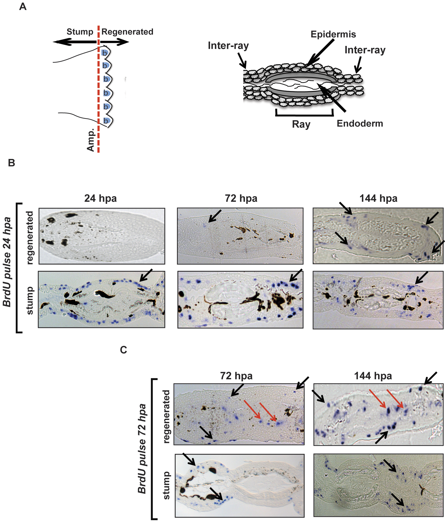 (A) Left section: Schematic cartoon of an adult zebrafish caudal fin where the amputation site is indicated (Amp.) and the location of the stump and blastema (b) regions is defined. Right section: Schematic diagram of a transverse section through the zebrafish adult caudal fin. The identity of the principal structures is indicated. (B) Transverse sections of fins that 24 hours following amputation were labeled for 15 minutes with BrdU and then sampled at 24, 72 and 144 hpa. Histological sections through the tip of the new regenerating fin tissue (regenerated) and through the “original” portion of the fin (stump) are represented. Representative blue stained BrdU positive nuclei are indicated by black arrows and are predominantly restricted to the epidermal layers of the stump at all time points and in the regenerated epidermis at 72–144 hpa. (C) Sections from a comparable experiment to that presented in panel B, except that the 15 minutes BrdU labeling period was performed 72 hours after amputation. BrdU positive nuclei are visible in both epidermis (black arrows) and in the blastema region (red arrows) at all time points in the regenerating tissue.