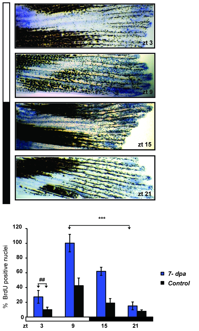 High amplitude circadian epithelial cell cycle rhythms persist during fin re-growth. Representative fin segments stained for BrdU incorporation at four zeitgeber times (ZT) distributed through one 24 hours cycle, starting 7 days post amputation (7 dpa). Below, quantification of the level of BrdU staining in fins amputated 7 days previously (blue bars) compared with non-amputated control fins (black bars). On the Y-axis is plotted the % of BrdU positive nuclei with respect to the largest value (ZT 9, 7 dpa). Each time point represents the mean value +/- SEM calculated for a total of n = 6 fins. The result of statistical analysis of the peak and trough values for the amputated fins is indicated by asterisks (Bonferroni′s post hoc test p<0.0001) and horizontal “brackets” above the graph. Furthermore, statistically significant differences observed at each time point between the amputated and non-amputated fins are indicated for simplicity, by the symbol “#” and a bracket above only the first time point (ZT3) (Bonferroni′s post hoc test p<0.001). White and black bars denote the light and dark periods respectively. The data were subjected to Cosinor analysis to test for the absence or presence of 24-h rhythmicity (see Table S1, Figure S2).