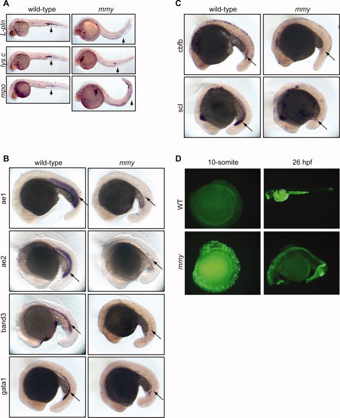 mmy mutants have severe defects in primitive hematopoiesis. A: Whole-mount in situ hybridization of myeloid markers (l-pln, lysc, and mpo) at 24 hpf. B: Expression of erythroid markers αe1 and αe2 globins, band3 and gata1 at 21 somite. C: Stem cell markers cbfb and scl are also down-regulated in mmy mutants. D: Acridine orange staining showing extensive apoptosis in mmy mutants through the entire embryos. For all probes tested, we typically used 30–40 embryos per hybridization. As such, 25% (8–10 embryos) will be mmy.
