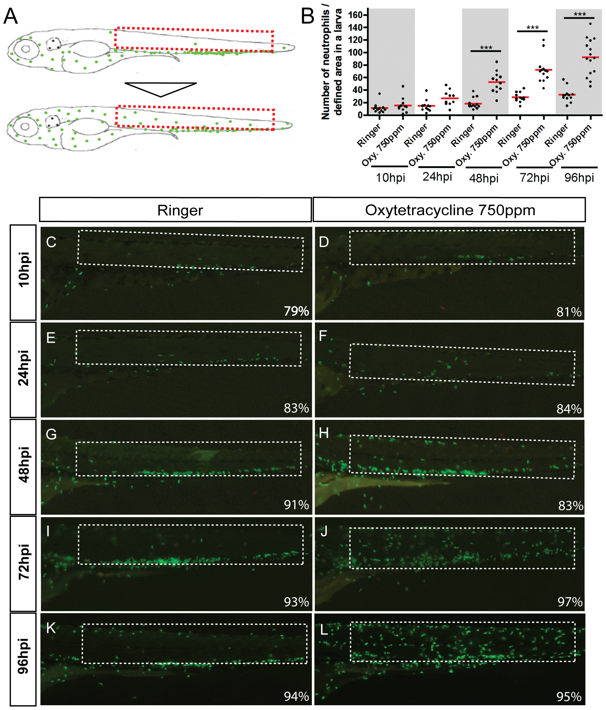 Incubation of Tg(mpx:GFP) transgenic larvae (that express GFP exclusively in neutrophils) in oxytetracycline 750 ppm induce a progressive migration of neutrophils from to the caudal hematopoietic tissue (CHT) to the entire tail. (A) Scheme of neutrophils localization in control and experimental larvae. (B) Quantification of neutrophils migration into the selected area. (C–L) Close up of the tail of control and experimental embryos at 10 hour post incubation (hpi), 24hpi, 48hpi, 72hpi and 96hpi. At 10hpi (C, D) and 24hpi (E, F) we did not detect any significant neutrophils migration. Later, at 48hpi (G, H) a discrete number of neutrophils migrate from de CHT to the tail. At 72hpi (I, J) and 96hpi (K, L), the presence of the GFP positive cells in the tail becomes clearly evident. The numbers of larvae that presented the phenotype shown is expressed as a percentage. For all experiments, at least 13 larvae were used for each condition. *** p<0.001.