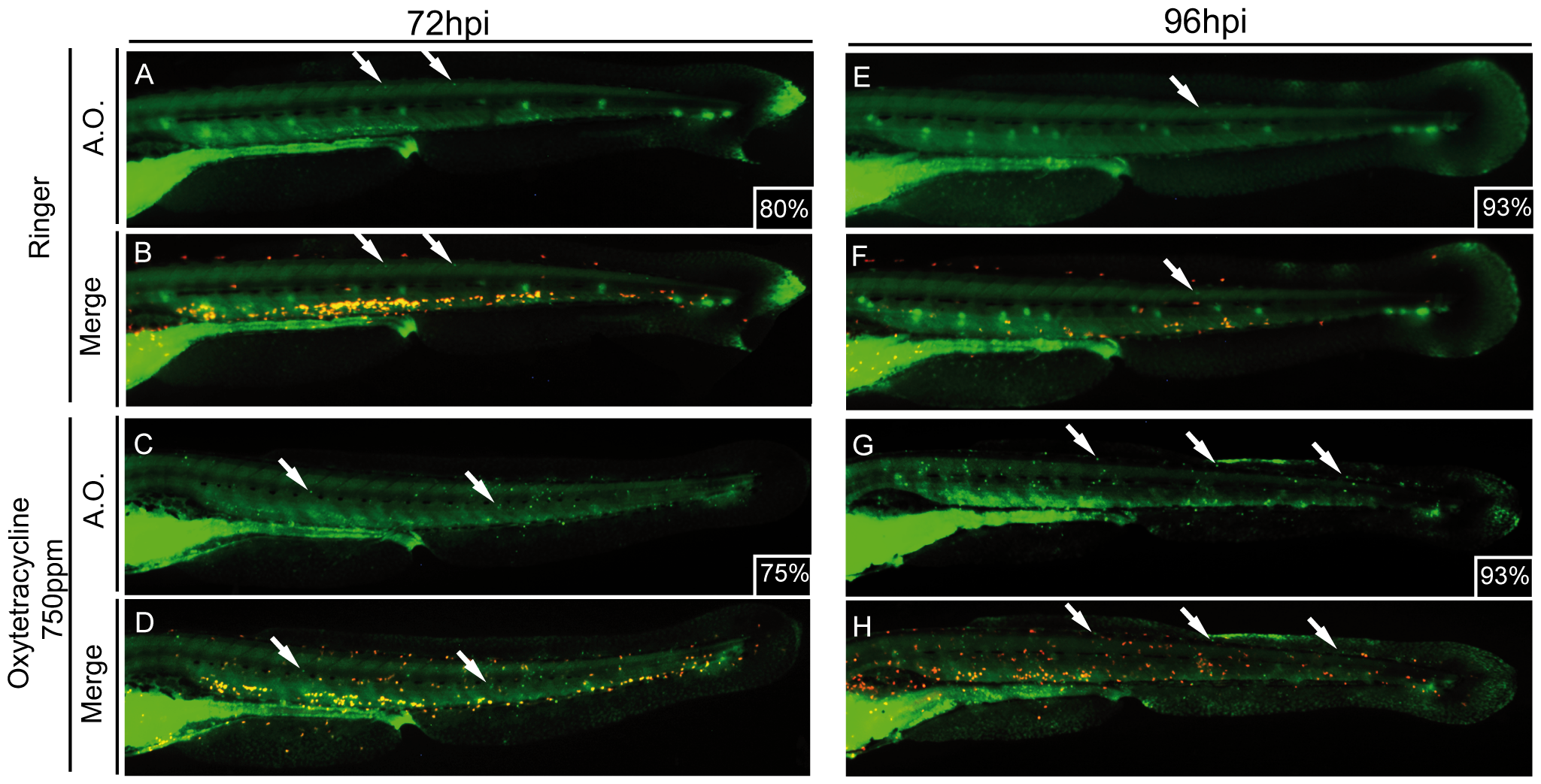 48hpf Tg(LyzC:DsRED2) transgenic larvae were incubated for 72 hrs (A–D) or 96 hrs (E–H) in oxytetracycline 750 ppm followed by an acridine orange stain to address cell death. Experimental larvae showed higher level of cell death (white arrows) compared to control at both time analyzed. The numbers of larvae that presented the phenotype shown is expressed as a percentage.