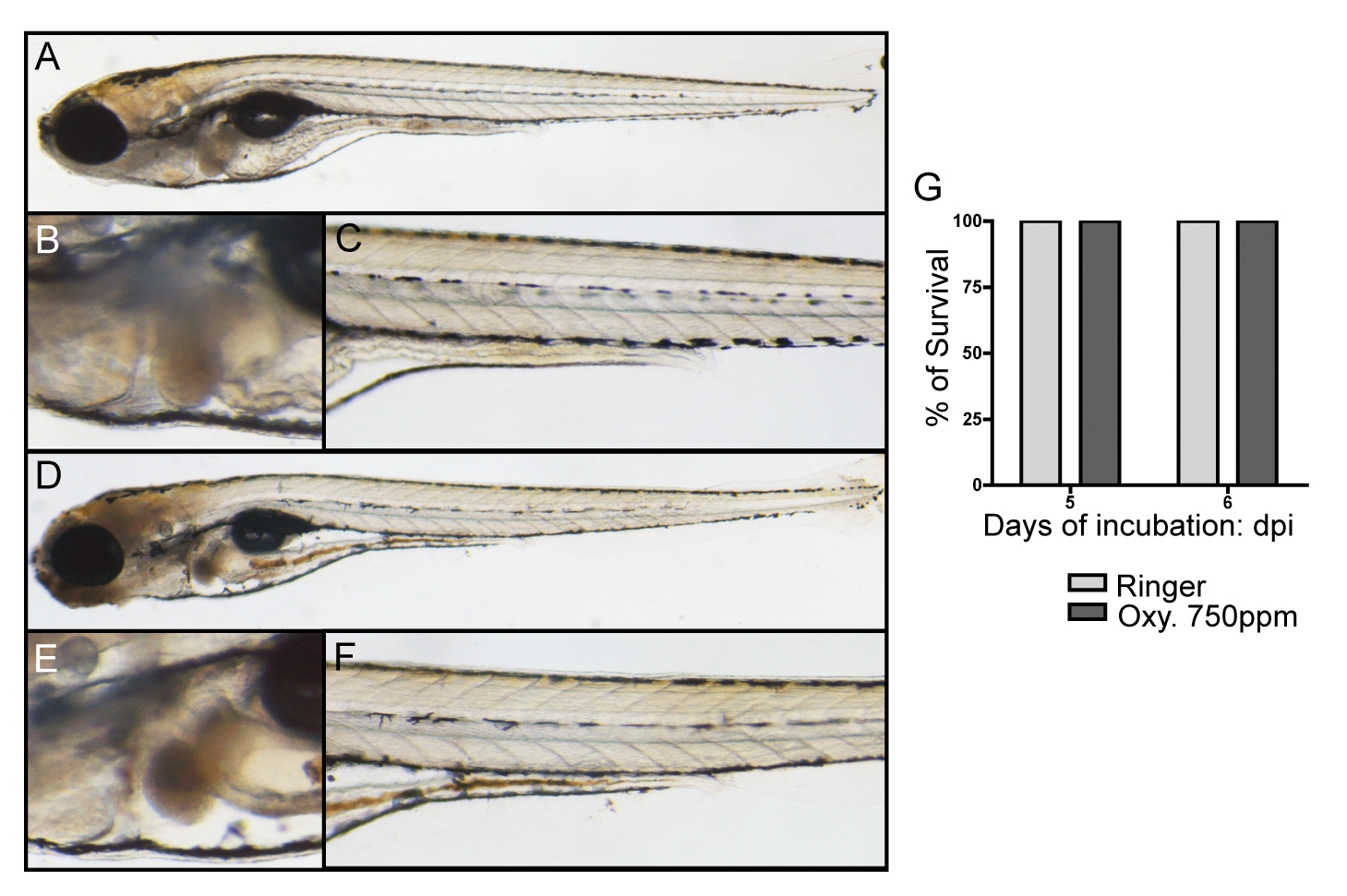 6 days of oxytetracycline exposure does not produce mortality nor adverse effects on larvae. Larvae were incubated during 120 hrs and 144 hrs to ensure that the treatment with oxytetracycline does not produce any detrimental effects on larvae. We did not found phenotypic effects such cerebral edema, bending of the tail (A, D), pericardial edema, abnormal heart function (B, E), or any somite malformation (C, F). No change in survival rate was detected at the time analyzed (G).