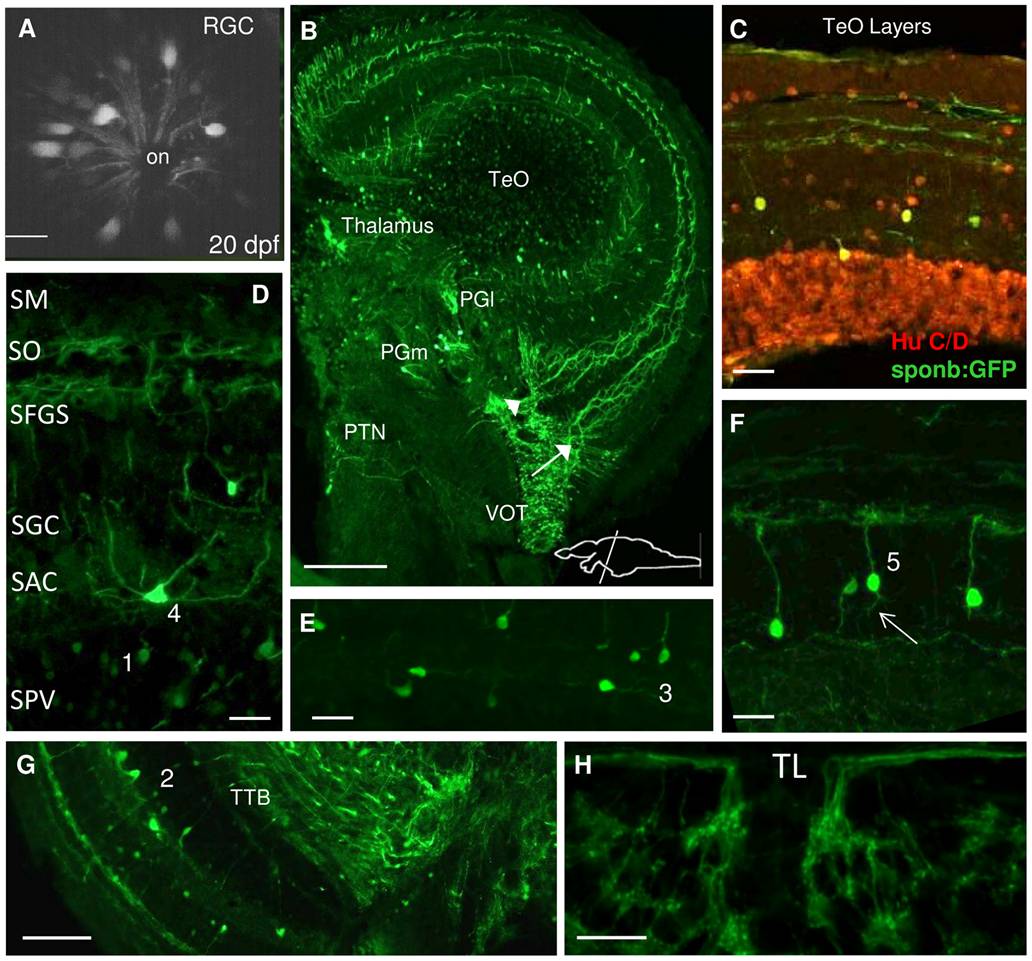 A. Spon1b expression in retinal ganglion cells (RGC) forming optic nerve (on) in live zebrafish at 20 dpf. Confocal image. B. Coronal section of adult zebrafish fish brain at the level of the optic tectum (TeO) showing spon1b-positive retino-tectal projections of the ventrolateral optic tract (VOT) splitting into two TeO layers: stratum fibrosum et griseum superficiale (SFGS, arrow) and stratum opticum (SO, arrowhead). Spon1b-positive cells in the medial (PGm) and lateral (PGl) preglomerular nuclei, and in the posterior tuberal nucleus (PTN). C. Double immunostaining in TeO demonstrates co-localization of spon1b:GFP (green) and Hu C/D (red) signal, confirming the neuronal nature of spon1b-positive cells. D. Coronal section identifying six TeO layers, with spon1:GFP expression in retinotectal projections in SO and SFGS, cell types 1 (in SPV border) and 4 (in SAC). E. Type 3 TeO cell, with horizontal projections in the SAC layer. F. Type 5 TeO cells with vertical projections in the SGC layer. G. Type 2 TeO cell with vertical projections traversing all TeO layers and forming the tectobulbar tract (TTB). H: Spon1b-positive cells and rami-like neuropil in the torus longitudinalis (TL). Scale bars: A: 10 μm; B: 100 μm; E-F: 15 μm; D,H: 20 μm, G: 50 μm.