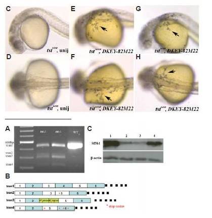 Fig. 3 Molecular consequences of sf3b1 mutations (A,B).Variant transcripts of sf3b1 in tstb460 mutants. (A) RT-PCR products were amplified between exon1 and exon6 of sf3b1 with 20-24 hpf AB wildtype and tstb460 homozygous mutant total RNA as template using Sf3b1aa (46)F and Sf3b1aa (579)R primers. The single AB wildtype RT-PCR product was 534 bp (tran1). tstb460 homozygous mutants contained 4 different transcripts; tran1(534 bp), and variant transcripts tran2(412 bp), tran3(390 bp), and tran4(312 bp). (B) Diagram of variant transcripts in tstb460 homozygous mutants. (C) Western blot analysis of Sf3b1 protein levels in wildtype, tstb460 mutant and hi3394a mutant embryos at 24 hpf. Lane 1: wildtype embryos; Lane 2: tstb460 homozygous mutants; Lane 3: hi3394a homozygous mutants; Lane 4: hsp>sf3b1 injected tstb460 mutants with melanophore phenotype rescue.