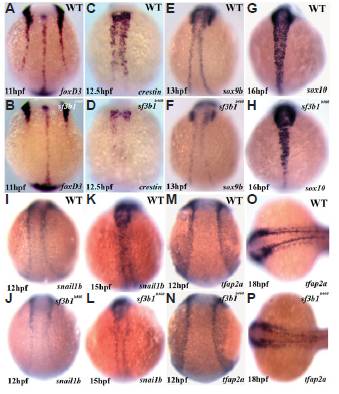Fig. 9 Significant abnormalities in trunk neural crest expression of critical transcriptional regulators as well as crestin at early developmental stages in sf3b1b460 mutants, but grossly normal expression in the cranial neural crest. Whole-mount in situ hybridization with foxd3 (A,B), crestin (C,D), sox9b (E,F), sox10 (G,H), snai1b (I-L), and tfap2a (M-P) antisense RNA probes. All embryos are dorsal view, anterior to top with the exception of (O,P) which is anterior to left.