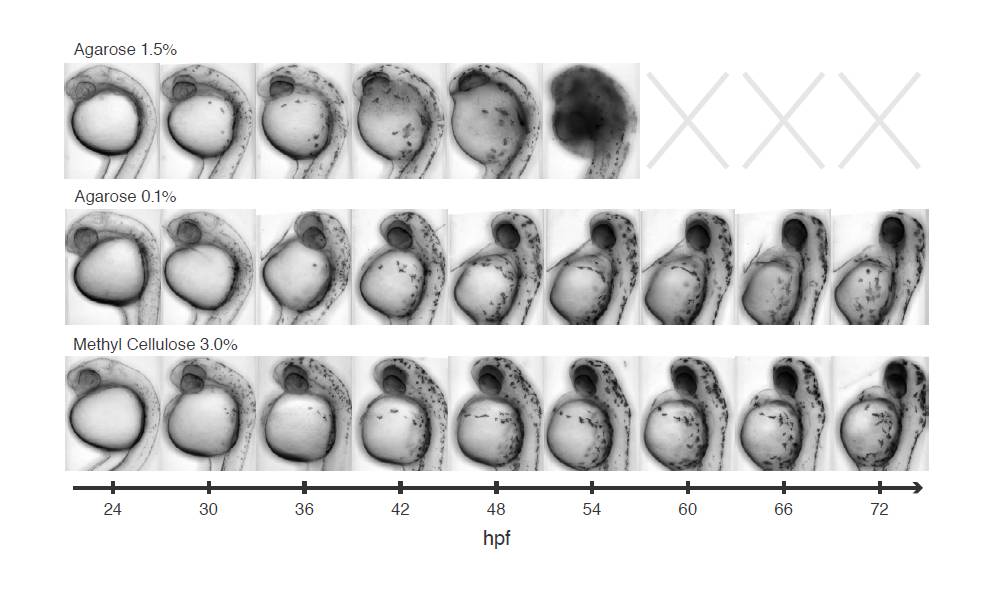 S2 Influence of mounting conditions on morphological development. Embryos were embedded in 1.5% agarose, 0.1% agarose in an FEP tube, or 3.0% methylcellulose in an FEP tube at 24 hpf and imaged in transmission with SPIM. Images were taken every 6 hours. The embryo embedded in 1.5% agarose is unable to undergo morphological changes and died at 50 hpf. Multilayer mounting methods allow outgrowth of the head.