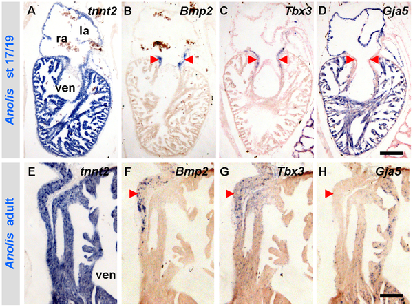 (A–D) Stage 17/19 Anolis hearts show complementary expressions of Bmp2 and Tbx3 to Gja5 in the developing myocardial atrioventricular canal (arrowheads). (E–H) The developmental expression of Bmp2, Tbx3 and Gja5 is maintained in the mature myocardial atrioventricular canal (left side shown). la, left atrium; ra, right atrium; ven, ventricle. Scale bars are 100 μm.