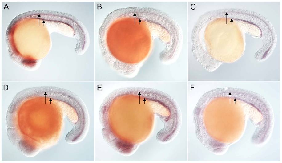 (A) Expression of efhc1 in the spinal cord (long arrow) and pronephric (kidney) duct (short arrow) of a wild-type zebrafish embryo, and in embryos ectopically expressing zebrafish FoxJ2 (B) and FoxJ3 (C), respectively. (D) Expression of spag6 in the spinal cord (long arrow) and pronephric (kidney) duct (short arrow) of a wild-type zebrafish embryo, and in embryos ectopically expressing zebrafish FoxJ2 (E) and FoxJ3 (F), respectively. Embryos depicted are at 20 hpf, oriented anterior to the left, dorsal to the top.