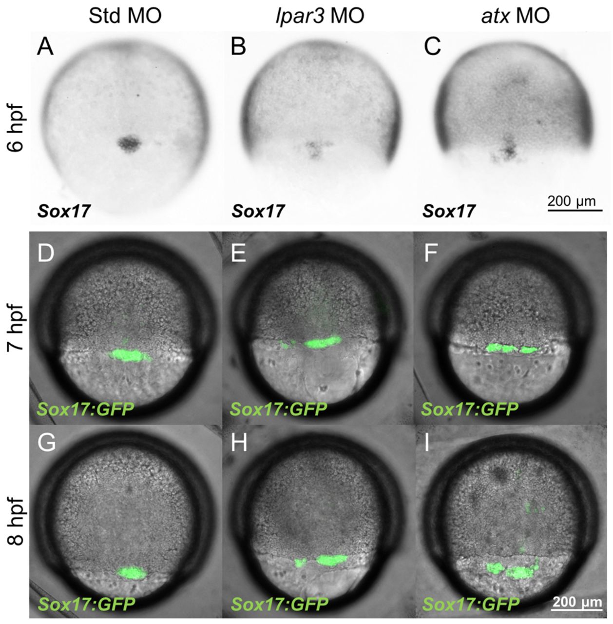 Fig. 4 DFC clustering is disturbed in lpar3 and atx morphants during epiboly. (A-C) Zebrafish embryos injected with the indicated MOs were subjected to WISH against sox17 at 6 hpf. In contrast to the ovoid-shaped DFCs cluster in Std MO-injected embryos (A), dispersed DFC clusters were observed in both lpar3 (B) and atx (C) morphants. (D-I) Tg (sox17:GFP) embryos were MO injected, cultured to 7 hpf and 8 hpf, and photographed under epifluorescence DIC microscopy. The DIC and epifluorescence images are superimposed and presented. More spread-out and linear-shaped DFCs were observed in both lpar3 (E,H) and atx (F,I) morphants compared with Std MO-injected embryos (D,G).