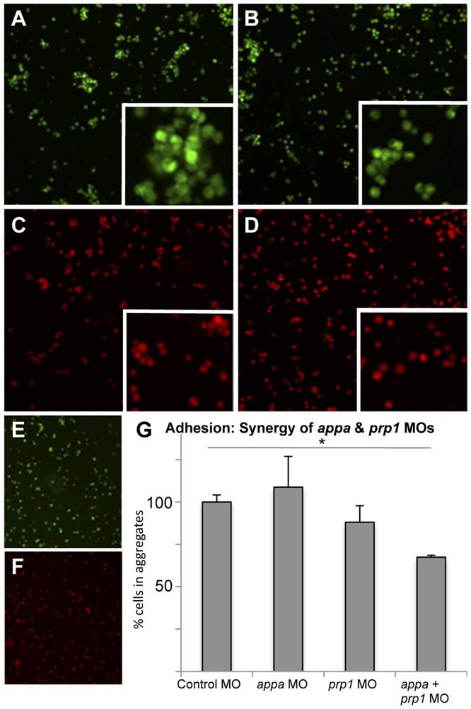 Low doses of prp1 and appa knockdown reagents (morpholinos, MO) are used here to show that their effects on cell adhesion synergize; higher doses of MOs used in this same assay showed individual MOs can also produce this effect. A–D. Zebrafish embryos injected with fluorescent dyes along with control MO (A), low dose of prp1 MO (B), low dose of appa MO (C), or a combination of the two sub-effective MOs (D), were dissociated to single cells and subjected to an aggregation assay. Insets show clumped cells (or lack thereof) at higher magnification. E, F. Aliquots of dissociated cells taken prior to aggregation confirmed that dissociation was successful. G. The ability of these cells to form aggregates (10 or more cells in direct physical contact) rather than stay alone in solution was quantified. Cells with slightly reduced App or slightly reduced Prp had only marginal decreases in aggregation ability, whereas cells with both proteins reduced were significantly reduced in their aggregation ability. N = 3. * = P<0.05.