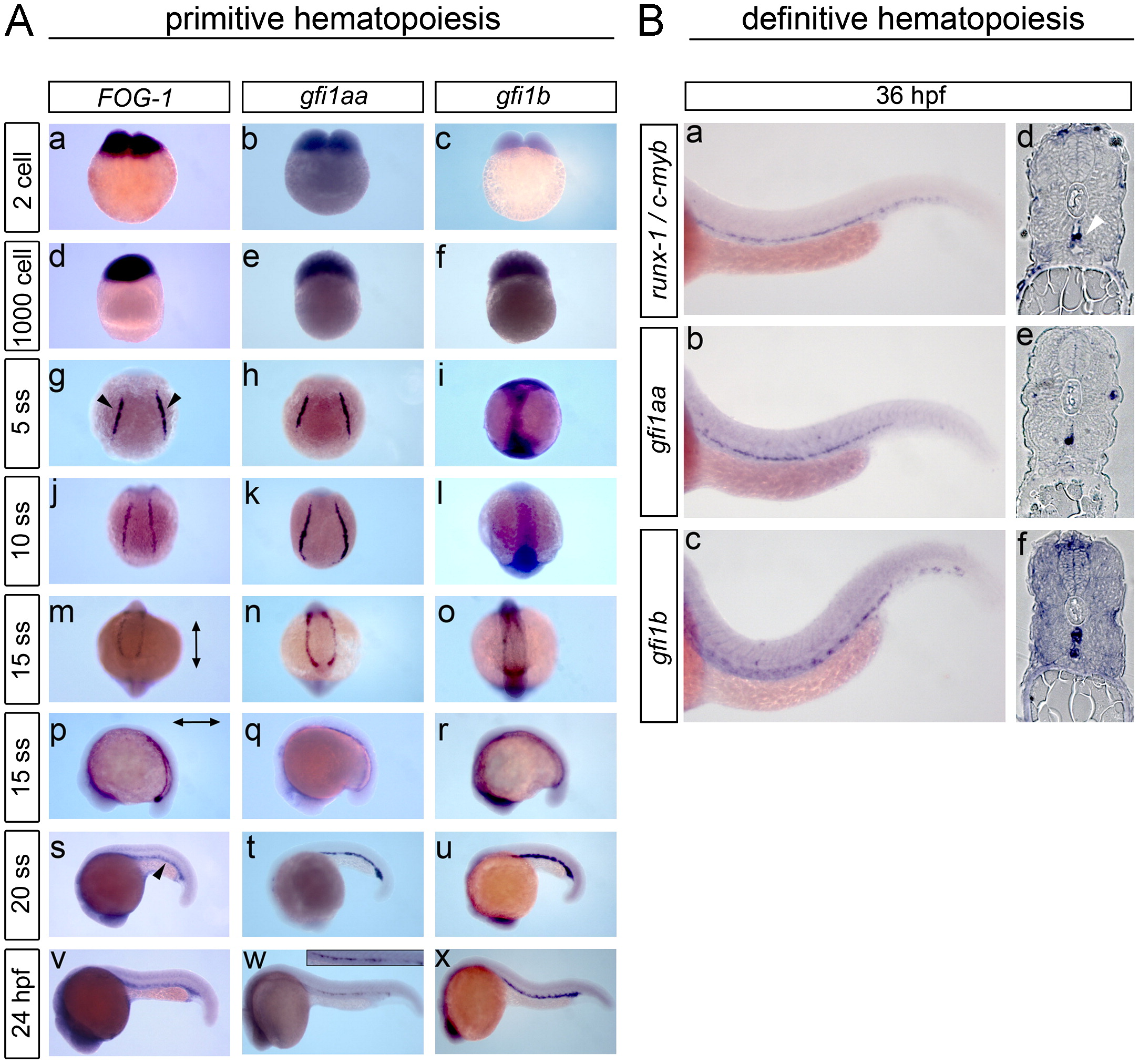 Fig. 2 gfi1aa and gfi1b expression pattern during primitive and definitive hematopoiesis. The expression pattern of gfi1aa and gfi1b was detected by WISH of developing zebrafish embryos. (A) For the primitive wave of hematopoiesis, FOG-1 was included as a reference control. Dark-blue staining indicates pre-zygotic maternal expression of gfi1aa and gfi1b transcripts, along with FOG-1, at the 2-cell and 1000-cell stages (a–f). At the 5 and 10 ss, zygotic gfi1aa and FOG-1 expression is localized to the LPM (black arrowheads) (g–h, j–k), while gfi1b is expressed in the ectoderm (i, l). As the LPM converges to the ICM at the 15 ss, gfi1aa and FOG-1 expression remains localized to the LPM (j–k, m, n), while gfi1b transitions from ectoderm to LPM expression (l, o). (The vertical arrow indicates the anterior–posterior axis and the horizontal arrow indicates the rostral–caudal axis.) gfi1aa and gfi1b are strongly expressed in the ICM at the 20 ss along with FOG-1 (s–u). At 24 hpf, gfi1b and FOG-1 remain strongly expressed in the ICM, while expression of gfi1aa shows a relative decrease in ICM expression (v–x, insert). (B) AGM expression of gfi1aa and gfi1b during definitive hematopoiesis was analyzed by whole-mount and sectioned in situs using runx-1 and c-myb as reference controls (a–f). The white arrowhead indicates AGM expression of runx-1 and c-myb in the ventral wall of the dorsal aorta (d).