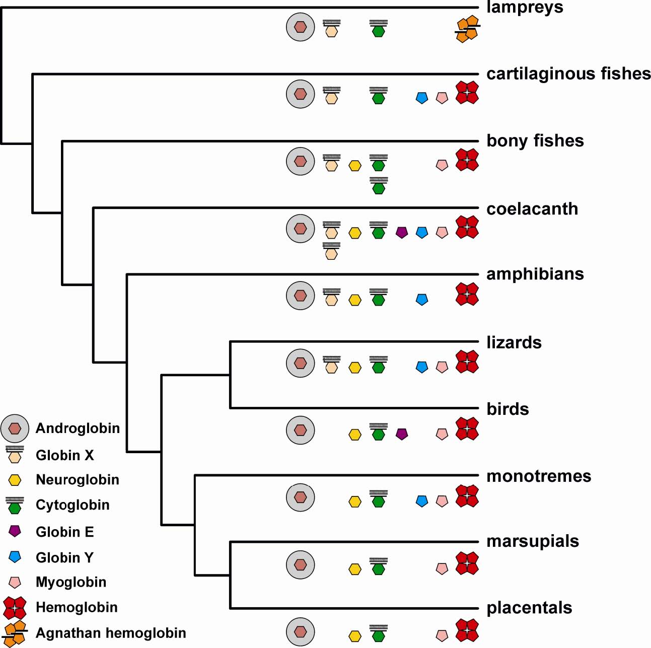 Distribution of globin genes in vertebrates. The hexagon indicates hexacoordinate globins, the pentagon pentacoordinate globins. N- and C-terminal extensions are indicated by bars, the acylation of the N-terminus of GbX is shown. Note the duplicated GbX genes in L. chalumnae and the duplicated Cygb genes in the teleosts. Globin sequences were identified in representative vertebrate genomes employing the BLAST algorithm. The genomes of man (Homo sapiens, build 37.3), mouse (Mus musculus build 37.2), opossum (Monodelphis domestica, build 2.2), chicken (Gallus gallus, build 2.1), zebra finch (Taeniopygia guttata, build 1.1) and zebrafish (Danio rerio, Zv9) were obtained from the NCBI web site at http://www.ncbi.nlm.nih.gov/projects/mapview/. The genome data from the coelacanth (Latimeria chalumnae, LatCha1), platypus (Ornithorhynchus anatinus, OANA5), anole (Anolis carolinensis, AnoCar2.0), clawed frog (Xenopus tropicalis, JGI_4.2), pufferfish (Tetraodon nigroviridis, TETRAODON7) and lamprey (Petromyzon marinus, Pmarinus_7.0) derive from http://www.ensembl.org. The elephant shark (Callorhinchus milii) genome data sequences were obtained from http://esharkgenome.imcb.a-star.edu.sg/. Additional information derives from BLAST searches of the non-redundant nucleotide and ESTs databases.