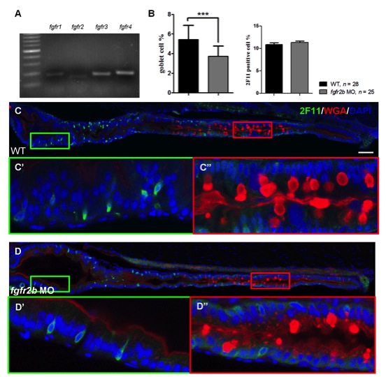 Fig. S1 The expression of fgfrs and the secretory cell differentiation of fgfr2b morphants. (A) fgfr1a, fgfr2, fgfr3 and fgfr4 gene were analyzed in 5 dpf zebrafish gut tissue by RT-PCR. (C) WT embryos and (D) fgfr2b morphants were double labeled using 2F11 antibody and WGA. The magnified image shows (C′–D′) enteroendocrine cells and (C′′–D′′) goblet cells. DAPI was used for nuclear counter staining (blue). (B) The bar charts show the percentages of 2F11 and WGA positive cells. Error bars indicate SD. Scale bar = 50 μm.