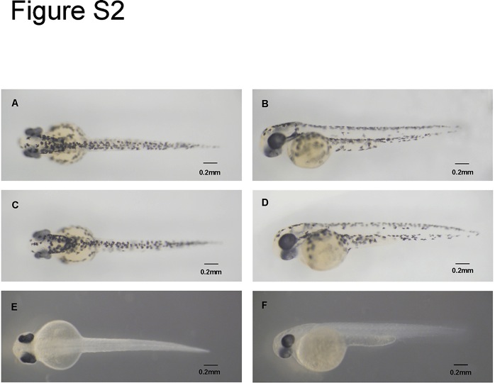 Fig. S2 Mitfa MO knock-down leads to loss of pigmentation in the trunk and smaller eyes. Phenotypes of WT (A–B), control morphants (C–D) and mitfa morphants (E–F) at 48 hpf are shown.