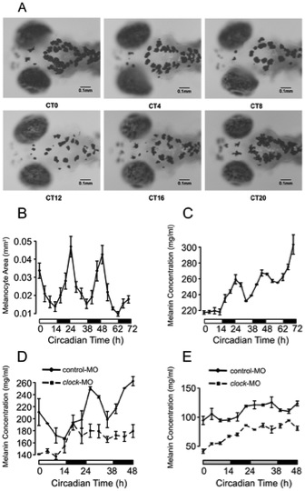 (A) Images of 5 dpf WT larval melanocytes in 4 hour intervals over 24 hours under LD conditions. (B) The area of melanocytes in WT larvae showed robust circadian rhythm in LD starting at 4 dpf (p<0.001, Fisher′s g test). (C) Melanin concentrations of WT larvae showed robust circadian rhythm in LD while increasing with time (p<0.002, Fisher′s g test after detrend). (D) The rhythm of melanin concentration was abolished in clock morphants in LD conditions, while the rhythm in control morphants remained robust. (E) Under DD conditions, the circadian rhythms of melanin concentrations in clock morphants and control morphants were not significant.