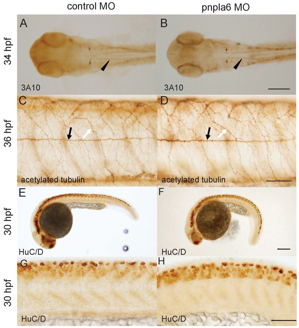 Fig. 6 Zebrafish pnpla6 acts cell-autonomously in motor neurons. (A-H) RLDx-labeled cells from embryos injected with control MO or pnpla6 MO were transplanted into wild-type embryos. (A) Homotopic transplantation of control or pnpla6 morphant cells. The cell mass injected is encircled. (B) Number of sides with at least one of the specified motor axon defects. (C,F) Immunostaining of embryos with antibodies to Znp-1 (green). (D,G) View of RLDx-labeled (red) donor cells in recipients. (E,H) In merged images, motor neurons from pnpla6 morphants (H) exhibit aberrant truncation and branching compared with control (E). Scale bars: 200 μm (A,B); 50 μm (C-H).