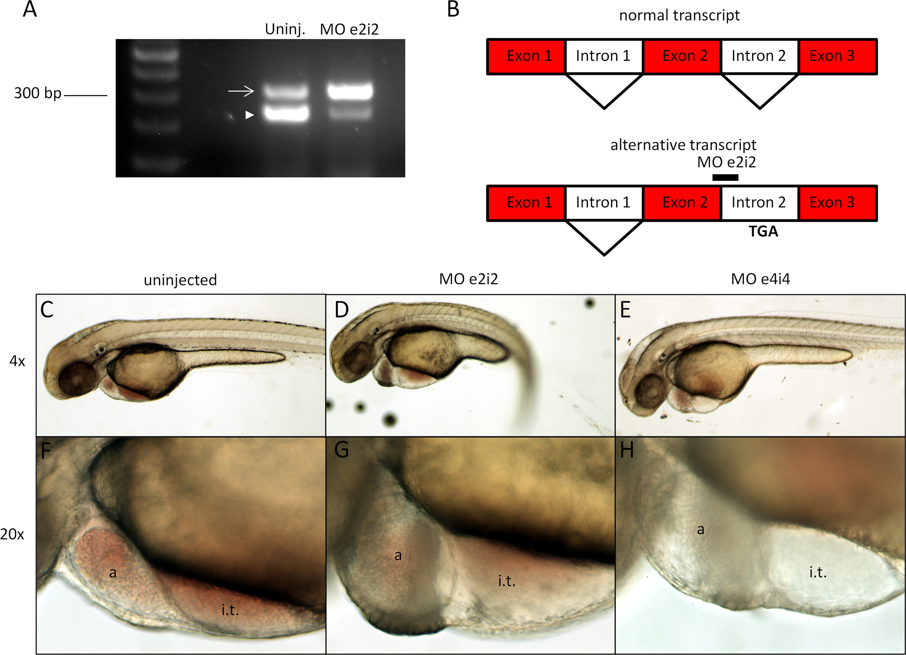 Fig. 2 ccm2l morphants exhibit heart and inflow tract defects. (A) Injection of MO e2i2 increases production of an endogenous alternatively spliced product (arrow) at the expense of the presumptive functional transcript (arrowhead). (B) Sequencing reveals that the alternatively spliced ccm2l mRNA, which is observed at increased levels in embryos injected with MO e2i2, incorporates intron 2, leading to an in-frame stop codon. (C and F) Uninjected embryos have compact heart chambers and narrow inflow tracts. (D,E,G,H) Embryos injected at the one-cell stage with 0.3 pMol MO e2i2 (D and G) or 1.0 pMol MO e4i4 (E and H) exhibit dilation of the atrium and inflow tract. Embryos injected with MO e2i2 often have a curved body axis. All images are taken from a lateral perspective with anterior to the left. a, atrium; i.t., inflow tract.