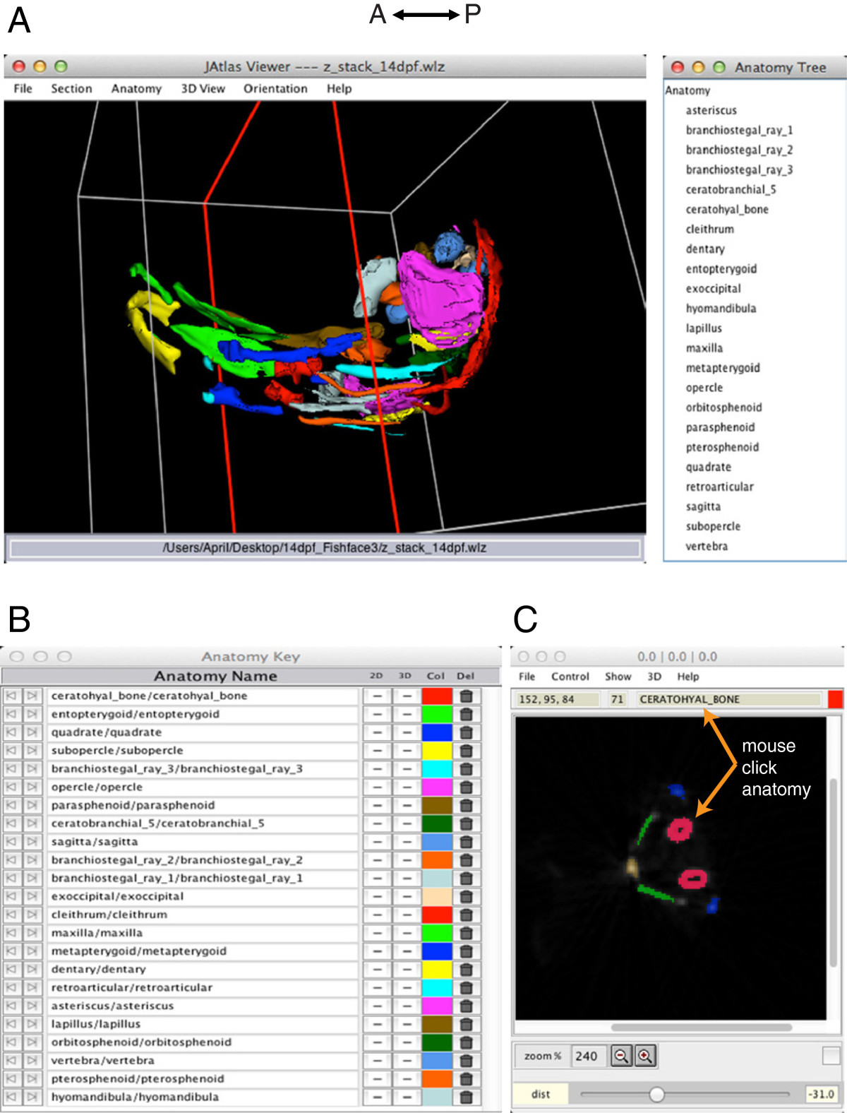 Fig. 2 Skeletal anatomy of the zebrafish head at 14 dpf visualized using Jatlas Viewer. The interactive 3D model of skeletal structures (A) can be rotated in a user-defined fashion with a click and drag of the mouse. The Anatomy Tree (right) lists all of the structures displayed in the 3D view. The Anatomy Key (B) shows the name of each structure in the 3D model and its color code. Structures can be switched on and off in the 2D and 3D viewer windows by clicking on "+/-" in the 2D and 3D columns of the Anatomy Key. Structures can be removed and replaced from the 3D and 2D viewers by clicking on the icon in the Del column. Colors can be changed by clicking in the Col column, which opens a palette of colors to choose from. In the 2D section view (C), structures shown in the 3D viewer are displayed in the same colors. With the ′mouse-click anatomy′ function, users can use their mouse to click structures on the 2D section, and the name appears at the top of the 2D viewer window. The plane of section is shown as a red outline in the 3D model (A), and can be changed by adjusting ′yaw′ and ′pitch′.
