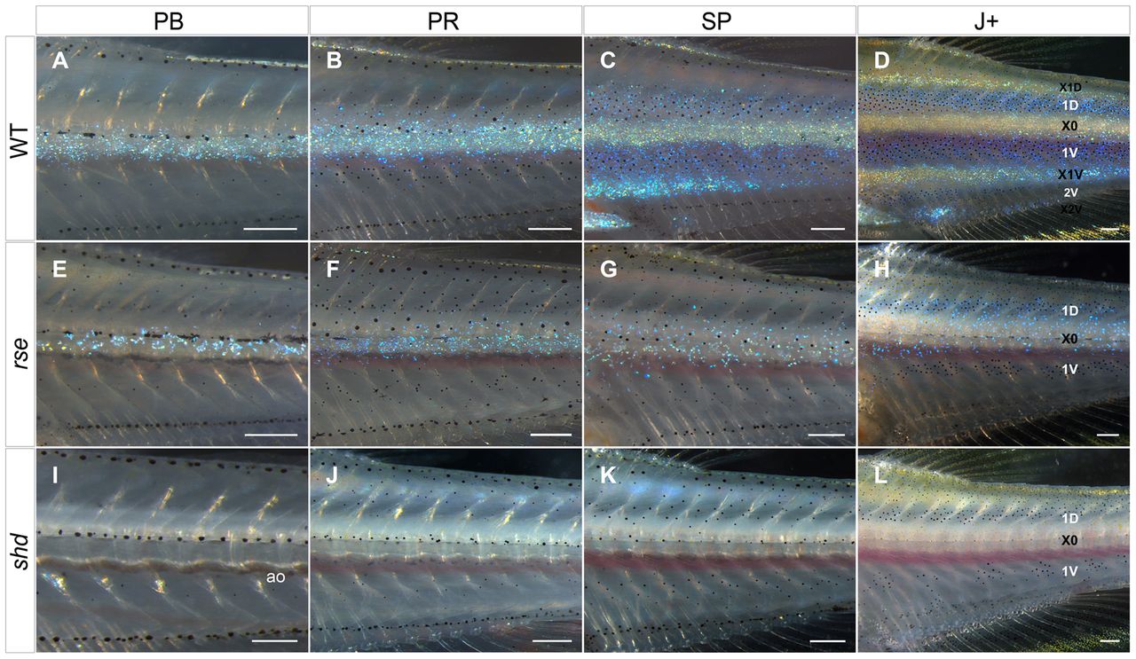 Fig. 6 Iridophore development in the posterior trunk. (A-D) Wild type. Iridophores appear first at the horizontal myoseptum and grow in density. In the melanophore region, they maintain their bluish reflection, whereas their colour turns golden in the dense interstripe regions. Melanophores of the larval lateral stripe that are still present along the horizontal myoseptum (A) are cleared from this area during stages PR and SP (B,C). (E-H) rse mutant. Iridophores grow in number but remain always below the level of wild type. (I-L) shd mutant. No iridophores develop. Metamorphic melanophores avoid the region of X0, but the clearance of larval melanophores from this area is considerably delayed compared with wild type. ao aorta. Stages: PB, pelvic fin bud. PR, pelvic fin ray. SP, squamation onset posterior. J+, juvenile+. Scale bars: 250 μm.