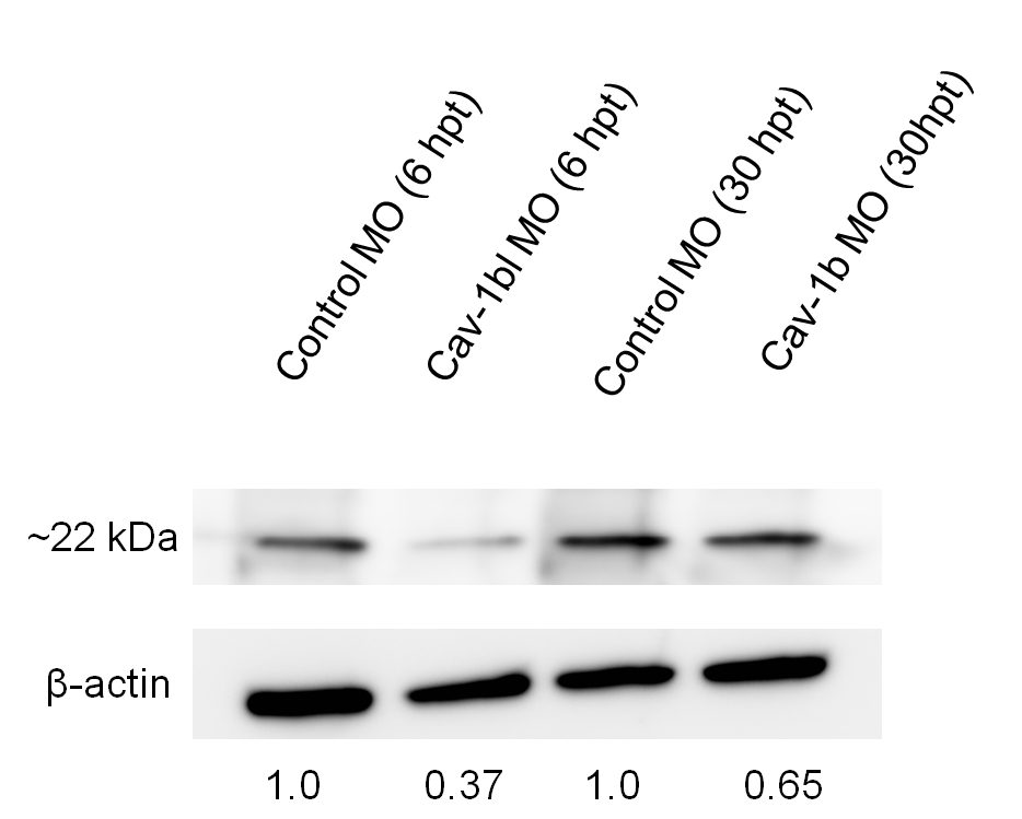 Knockdown of Cav-1b in ZFL cells. Western blot showing efficacy of MO (morpholino) in ZFL cells. Cells were transfected with Control morpholino (MO) or Cav-1b MO to knock down the expression of Cav-1b. Samples were taken at 6 and 30 h post transfection (hpt), corresponding to the time points used to perform experiments shown in Figure 7. At 6 hpt there is a marked decrease in cav-1 protein expression compared to control cells, while at 30 hpt a slight decrease in cav-1 protein expression is still observed. Membranes were re-probed with antibody against β-actin to control for protein loading.