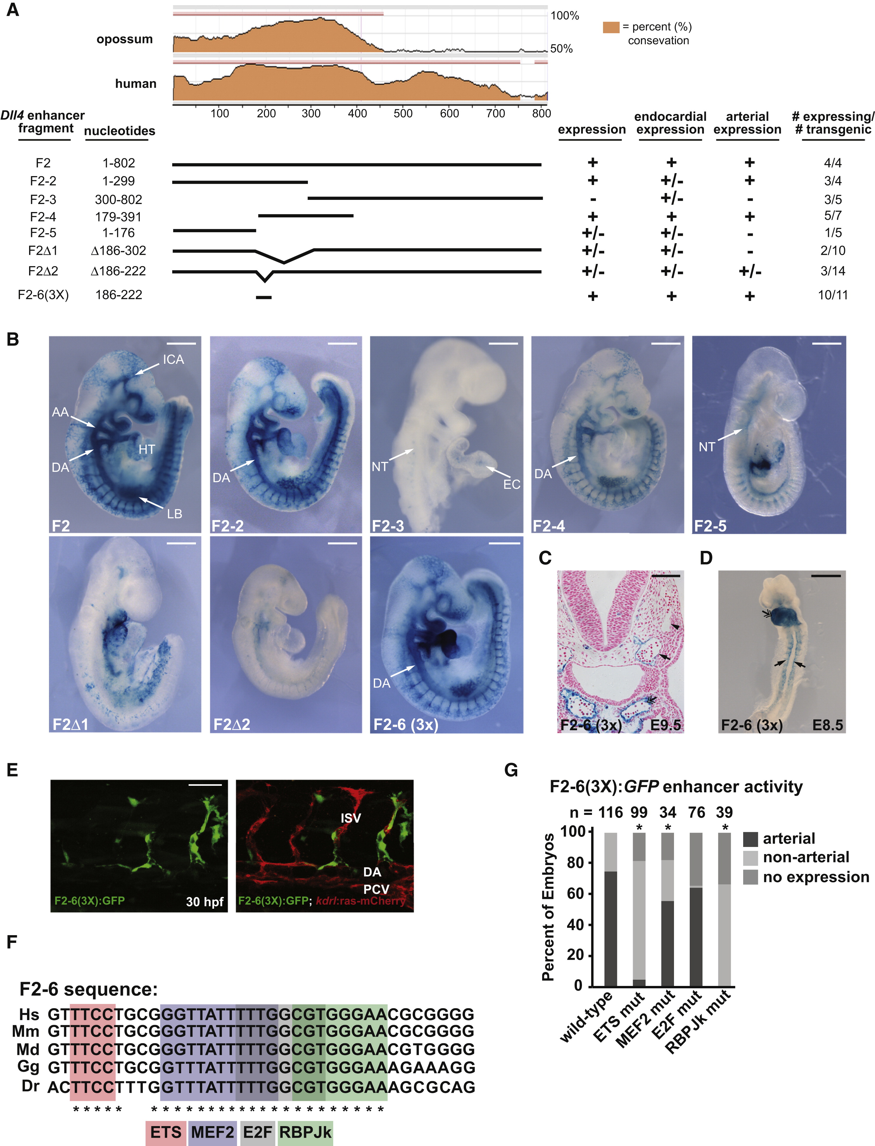 Isolation of a Minimal Dll4 Enhancer Element that Drives Arterial-Specific Expression (A) Sequence conservation of the F2 enhancer and deletion constructs used in transgenic analyses. Endocardial and arterial expression is indicated. (B) Representative transgenic embryos from (A) at E9.5. F2, F2-2, and F2-4 directed strong arterial-specific expression. F2-3 directed weak endocardial (EC) expression. Deletion of a highly conserved 100 bp and 36 bp region (F2Δ1 and F2Δ2, respectively) abrogated arterial activity of the F2 enhancer. The 36 bp region, F2-6, was sufficient, when arrayed in triplicate, F2-6(3X), to direct arterial expression. DA, dorsal aorta; AA, aortic arch; LB, limb bud; NT, neural tube; ICA, internal cerebral artery; HT, heart. Scale bar represents 500 μm. (C) Transverse section of X-gal stained F2-6(3X)-lacZ embryo at E9.5. DA (arrow); cardinal vein (caret); EC (double arrow). Scale bar represents 100 μm. (D) Whole-mount image of F2-6(3X)-lacZ embryo at E8.5. Scale bar represents 500 μm. (E) Mosaic expression of F2-6(3x):GFP in the DA and intersomitic vessels (ISVs) of a transient transgenic 30 hpf zebrafish embryo. PCV, posterior cardinal vein. Scale bar represents 50 μm. (F) Sequence comparison of F2-6 in human (Hs), mouse (Mm), opossum (Md), chicken (Gg), and zebrafish (Dr). Cis elements are indicated. (G) Each cis element was mutated in F2-6(3X):GFP and transient transgenics were assessed for arterial expression at 24 hpf. The percentage of embryos with expression in arteries (i.e., DA and/or ISV), expression elsewhere, and no expression, are indicated. Asterisk indicates a significant difference in arterial expression compared to wild-type (χ2 test). See also Figure S2.