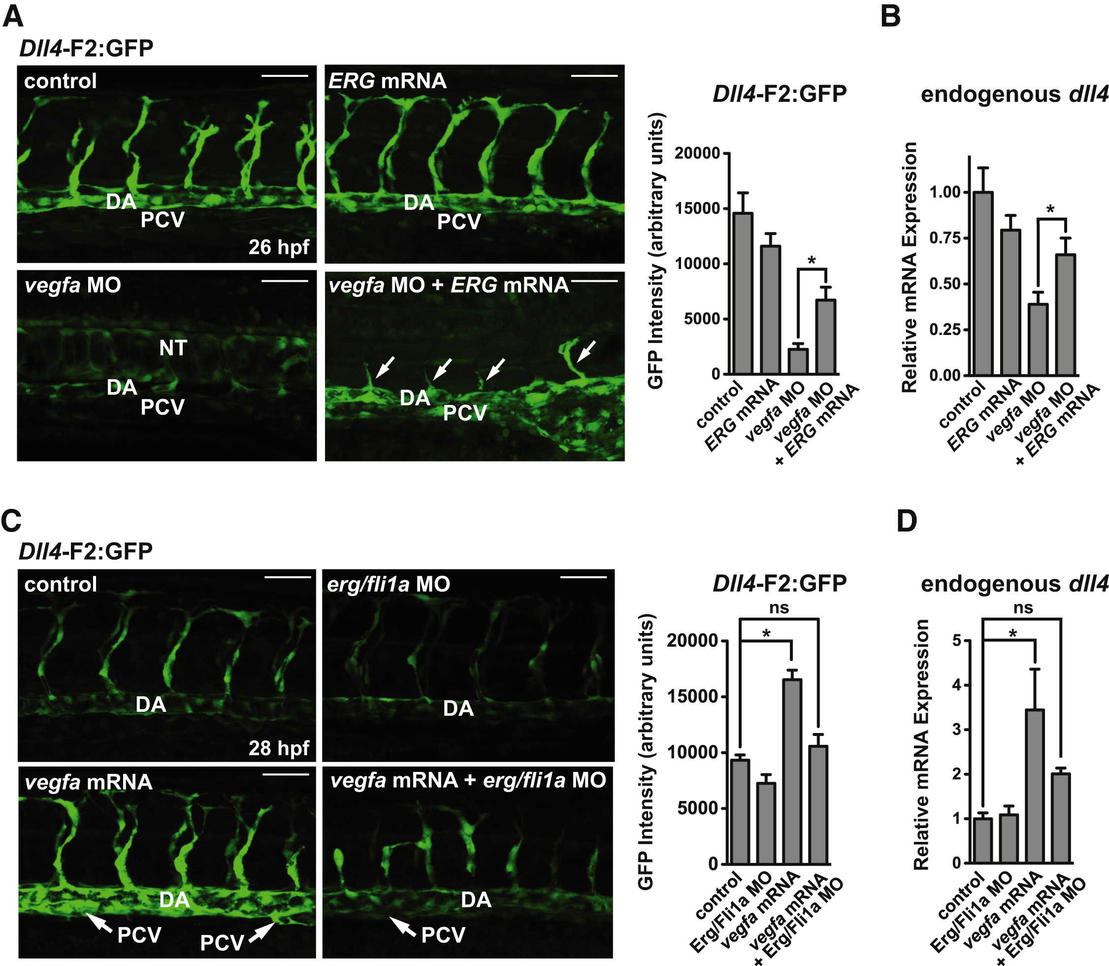 ETS Factors Act Downstream of Vegf to Induce dll4 Expression (A) ERG mRNA (200 pg) injection partially rescued F2:GFP expression and sprouting (arrows) in vegfa morphants at 26 hpf. Representative images (left) and quantification (right, n = 10–12). (B) dll4 mRNA expression (normalized to kdr expression) was assessed by qRT-PCR in individual 26 hpf embryos injected with ERG mRNA and/or vegfa morpholino (n = 4). (C) Partial knockdown of erg and fli1a with a sub-phenotypic dose of morpholino inhibited the induction of F2:GFP expression in both the dorsal aorta (DA) and posterior cardinal vein (PCV) in Vegfa121/165 mRNA-injected embryos. Arrows indicate collapsed PCV. Quantification of 10–13 embryos per group is shown. (D) Endogenous dll4 mRNA was assessed by qRT-PCR in individual embryos at 24 hpf (n = 5). All graphical data are mean ± SEM. See also Figure S6.