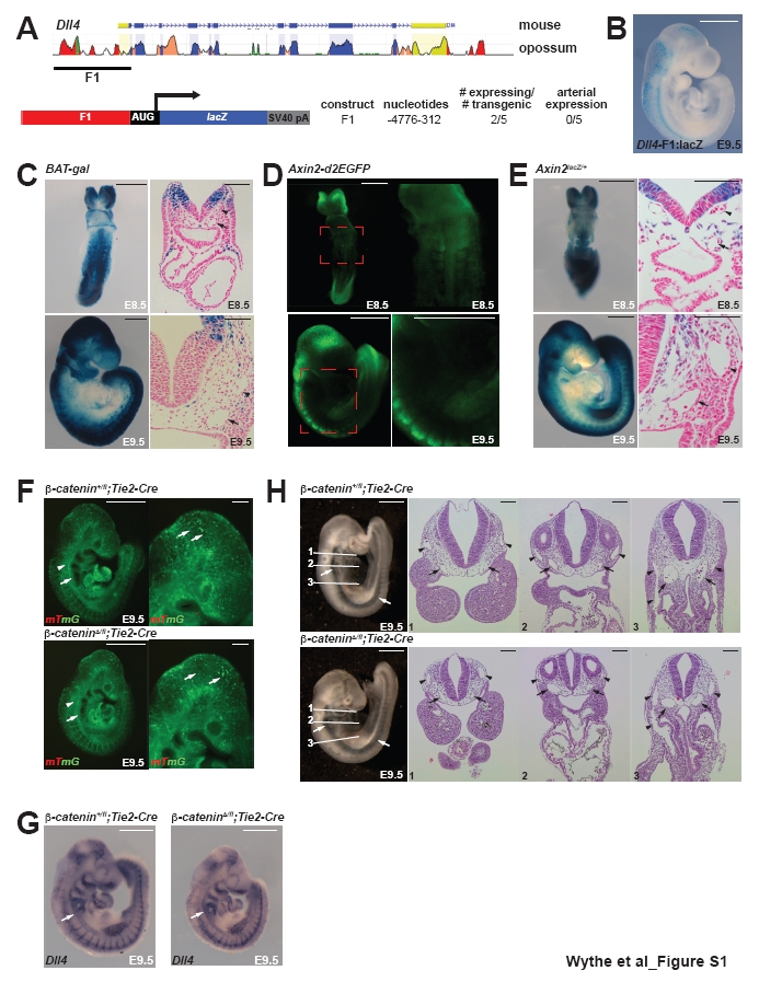 Wnt/β-Catenin signaling is not active in early arteries and does not regulate early Dll4 expression. (A) Conservation between murine and opossum Dll4 with location of fragment 1 (F1) indicated. Transgenic analysis of F1-lacZ (E9.5) is below. (B) Representative whole-mount F1-lacZ transgenic embryo. (C) Wholemount (left) and transverse sections (right) of BAT-gal embryos at E8.5 (n=5) and E9.5 (n=4). Dorsal aorta (arrow); cardinal vein (caret). (D) Whole-mount (left) and zoomed-in (right) Axin2-d2EGFP embryos at E8.5 (n=6) and E9.5 (n=8). (E) Whole-mount (left) and transverse sections (right) of Axin2nlacZ/+ embryos at E8.5 (n=3) and E9.5 (n=5). (F) Vascular patterning in endothelial-specific Ctnnb1 (β-catenin) loss-of-function (ECKO) embryos was normal, as visualized by Cre-mediated recombination of a GFP reporter allele (Rosa26-mTomato-lox-stop-lox-mGFP [mTmG]) (left). The dorsal aorta (arrow) and cardinal vein (caret) are indicated. A zoomed-in view (right) of the brain vasculature demonstrates a less remodeled vascular plexus (indicated by arrows) in the ECKO (n=7) embryonic brain compared to control (n=10) embryos. (G) Dll4 in situ hybridization indicates normal expression in the dorsal aorta (arrow) of Ctnnb1 ECKO embryos (n=4). (H) No defects in arteriovenous morphology in Ctnnb1 null (n=5) embryos were observed, as assessed by ink injection (as ink filled the entire dorsal aorta (arrows)) and H&E histology of serial cross-sections through the rostral and caudal planes of the dorsal aortae and cardinal veins. Dorsal aorta (arrow); cardinal vein (caret). Scale bars: 500 μm (B-H, whole-mount), 100 μm (C-H, sections and zoom ins).