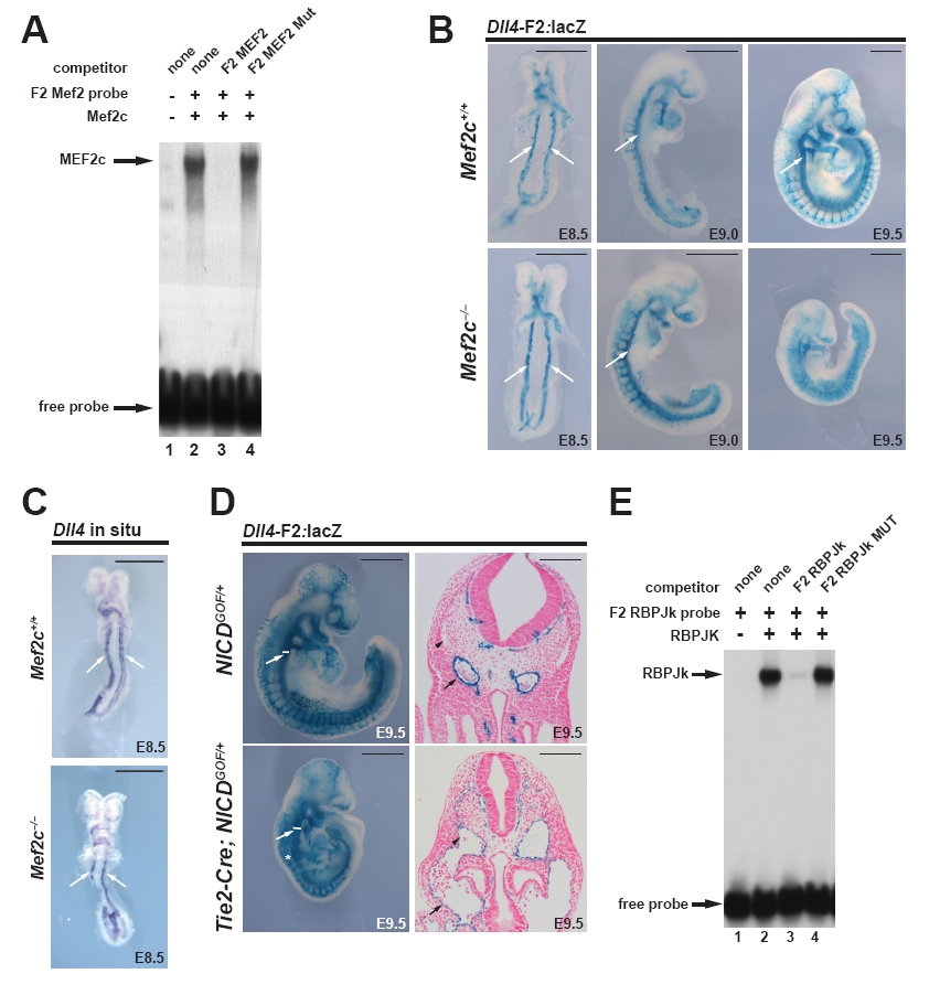 (Related to Figure 3): MEF2C and RBPJk bind to the F2 enhancer, and overexpression of NICD in the endothelium can drive F2 expression in the vein, while MEF2C is dispensable for early arterial Dll4 expression. (A) Recombinant MEF2C protein was used in an electrophoretic mobility shift assay (EMSA) with a radiolabelled double-stranded oligonucleotide representing the F2-6 MEF2 binding site. Lane 1 contains reticulocyte lysate without recombinant MEF2C (represented by a minus sign). MEF2C efficiently bound to the F2-6 MEF2 site (lane 2) and this binding was efficiently competed by an excess of the unlabeled wild type F2-6 MEF2 element (lane 3), but not by an excess of a mutant form of this site (lane 4). (B) The F2-lacZ enhancer was crossed into the Mef2c+/- background, and wild-type and homozygous mutant embryos were stained for X-gal at E8.5, 9.0, and E9.5. No difference in enhancer activity was observable in mutant embryos compared to wild-type (Mef2c+/+) littermates at early stages of vascular development (i.e. E8.5-E9.0) (n e 5 for each genotype). The dorsal aorta is indicated by arrows. Scale bars = 500 μm (C) Expression of Dll4 mRNA was examined by in situ hybridization in Mef2c+/+ and Mef2c-/- embryos. No difference in expression was noted at E8.5 (n=3 for each genotype). Scale bars = 500 μm (D) NICD was over-expressed in the endothelium via Tie2-Cre-mediated activation of a R26N1ICD allele. Whole-mount images (left; scale bar = 500 μm) and sections (right; scale bar = 100 μm) are shown. The presence of an arteriovenous malformation (AVM) is indicated by an asterisk and the dorsal aorta (arrow) and cardinal vein (caret) are also indicated. Expression of F2 was expanded into the cardinal vein in Notch over-expression embryos. (E) EMSA showing RBPJk binding to a probe corresponding to the F2-6 RBPJk site. Binding was competed by an excess of unlabeled wild-type but not RBPJk mutant probe.