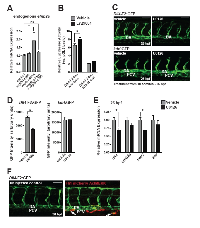 Figure S6 (Related to Figure 6 and Figure 7): The F2 enhancer and endogenous Dll4 expression are regulated by Vegf/MAP kinase signaling. (A) From the experiment shown in Figure 6C,D, induction of Vegfa-inducible efnb2 was also inhibited in embryos injected with erg/fli1a morpholinos. Shown is qRT-PCR from 5 individual embryos per group (mean ± SEM). * indicates a significant difference by 1-way ANOVA. ns, not significant. (B) F2-luciferase activity was enhanced upon inhibition of PI3 kinase signaling (LY29004 treatment) in BAEC. The activity of F2-luciferase was decreased, and the responsiveness to PI3K inhibition was lost, when the ETS-B site was mutated. Shown is a representative experiment, triplicate determinations (mean ± SEM). (C) F2:GFP or kdrl:GFP embyros were treated the MAP kinase inhibitor, U0126, starting at the 10-somite stage, and imaging was performed at 26 or 28 hpf. F2:GFP expression was decreased in the presence of U0126, but kdrl:GFP was unaffected. (D) Quantification of (C) is shown (n=4 per group; mean ± SEM). (E) Expression of endogenous dll4, efnb2a, hey2 and kdr was assessed by qRT-PCR (n=5-10 individual embryos; mean ± SEM). (F) Embryos were injected with a construct that drives expression of constitutively active MEKK in the endothelium (Fli1-mCherry-ActMEKK). In embryos with expression of the construct in the vein, F2:GFP expression was also observed in venous cells (arrows).
